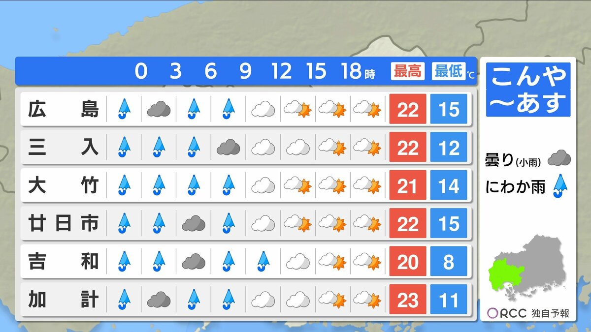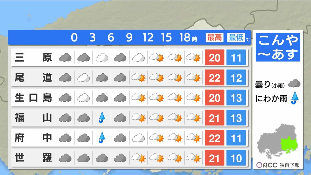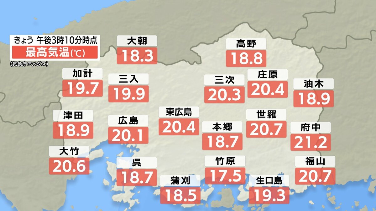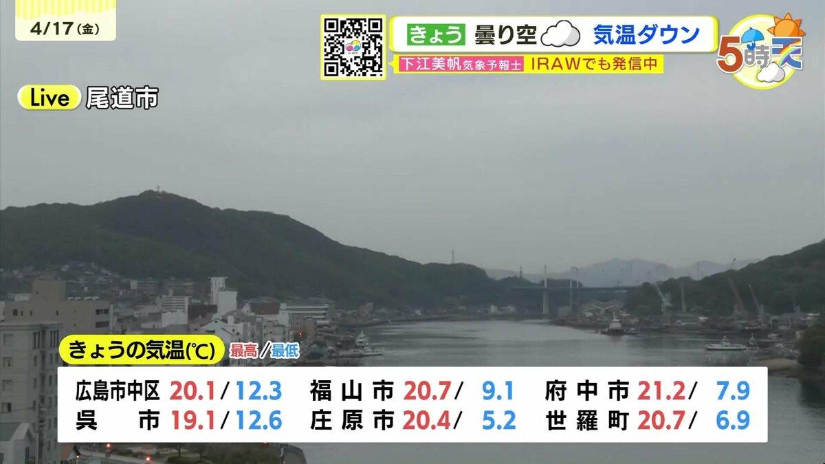 きょう17日(金)の広島県内は、朝から雲が広がり、午後は所々弱い雨が降りました。最高気温は、広島市中区20.1℃ 呉19.1℃ きのうは夏日の地点が多く出ましたが、きのうと同じくらい~7℃ほど低くなりました。