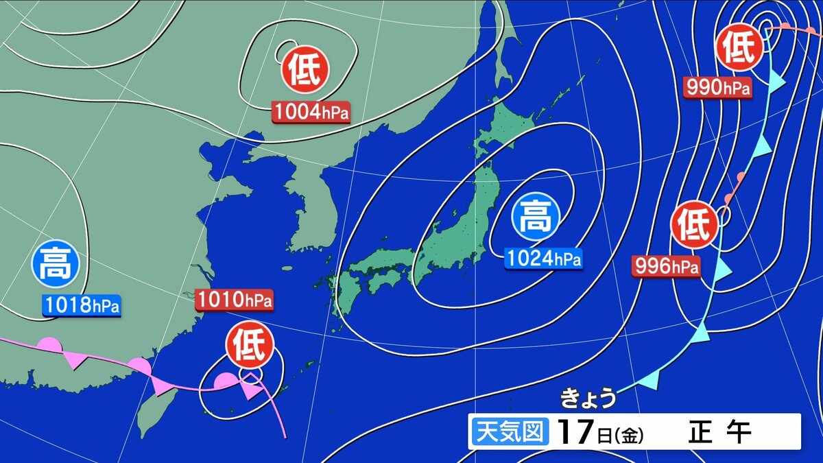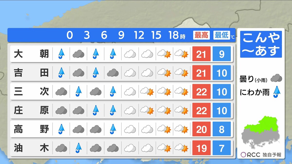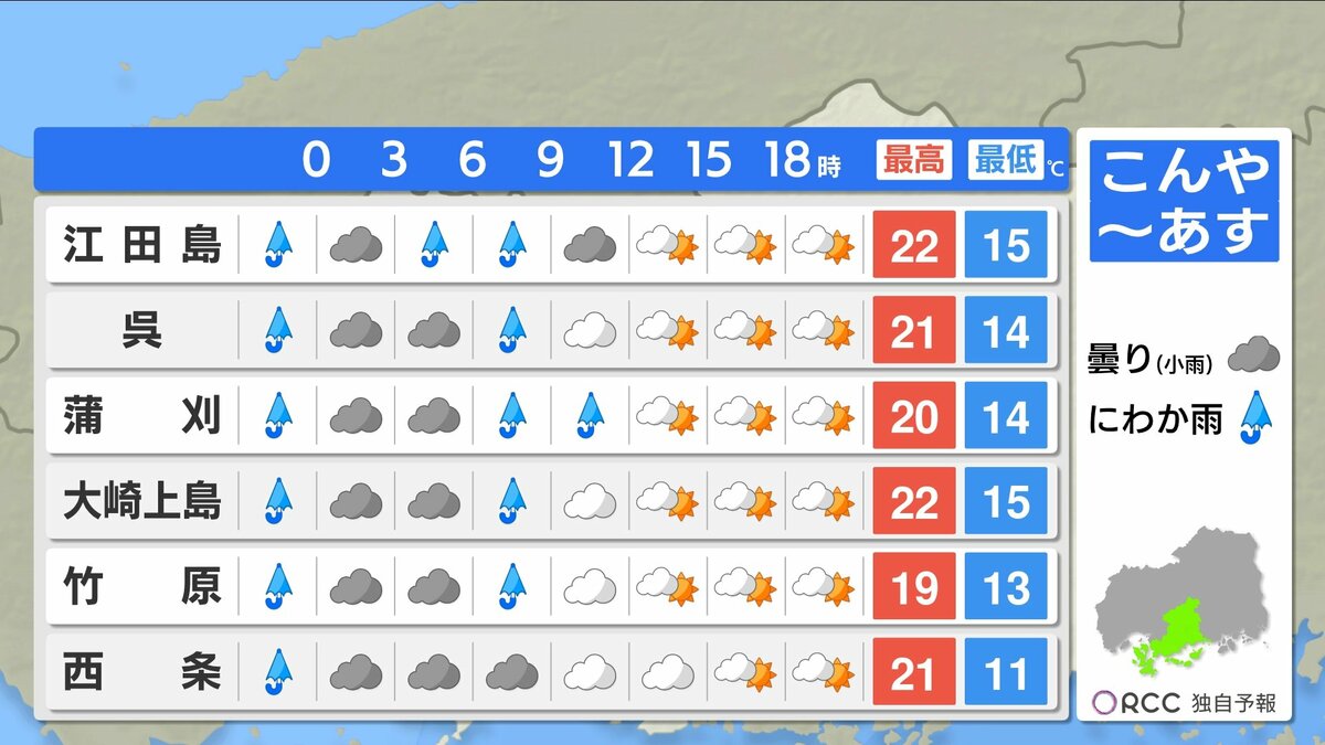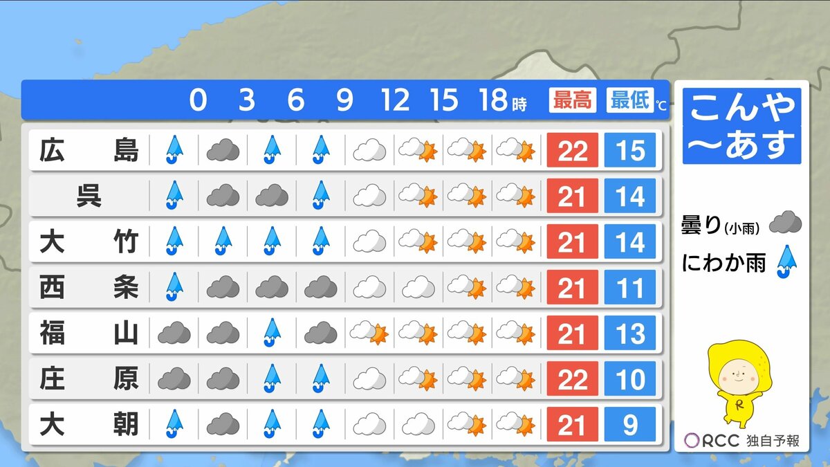 きょう17日(金)の広島県内は、朝から雲が広がり、午後は所々弱い雨が降りました。最高気温は、広島市中区20.1℃ 呉19.1℃ きのうは夏日の地点が多く出ましたが、きのうと同じくらい~7℃ほど低くなりました。
