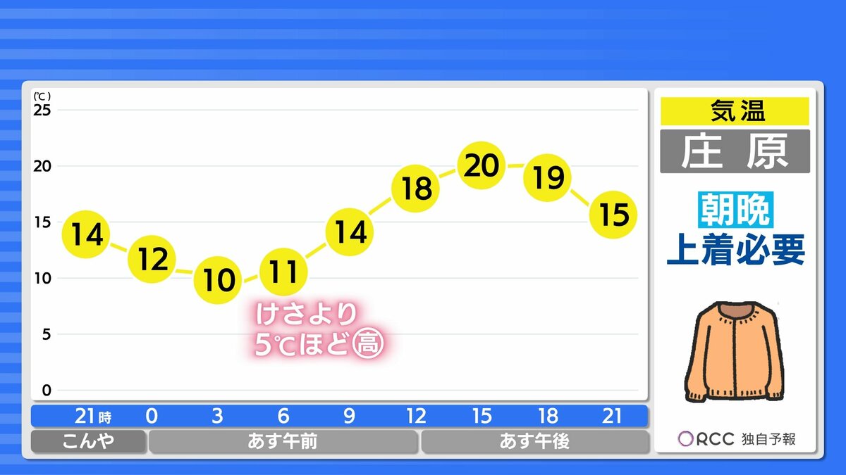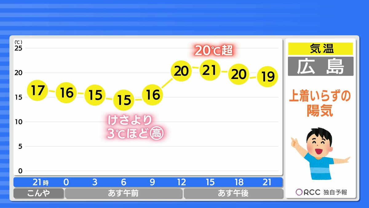 あす朝の冷え込みは緩み、沿岸部で13℃~15℃くらいでしょう。日中の気温は20℃を超え、昼間は上着いらずの暖かさでしょう。
