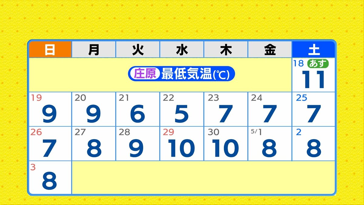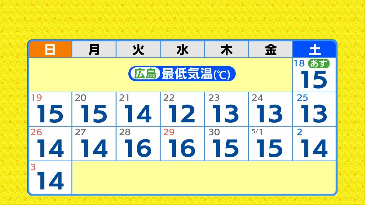 南部の最低気温は、5月上旬にかけて15℃前後の日が多いでしょう。冷え込みはほとんどなく、過ごしやすい日が続きます。そろそろ厚手の上着などの冬物は片付けて良さそうです。晴れて、空気が乾燥した日は衣替え日和です。今週末は、特に日曜日が衣替えのチャンスでしょう。