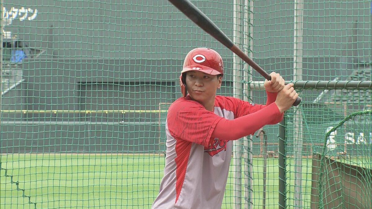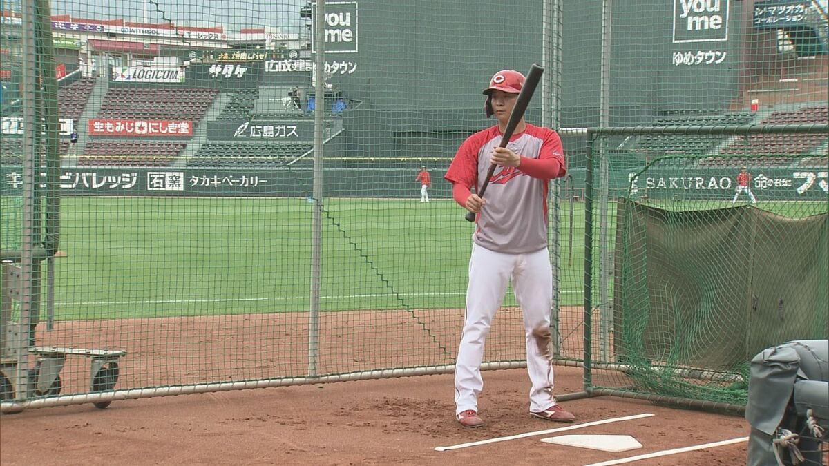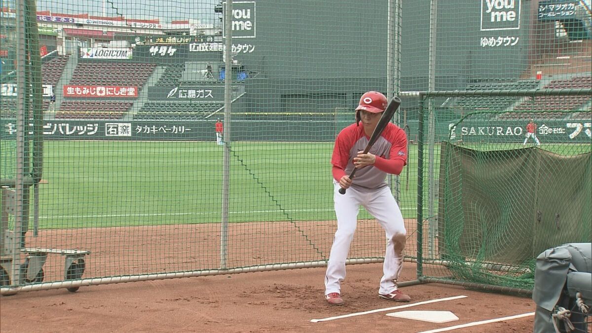 試合前に練習する大盛穂(4月17日・マツダスタジアム)