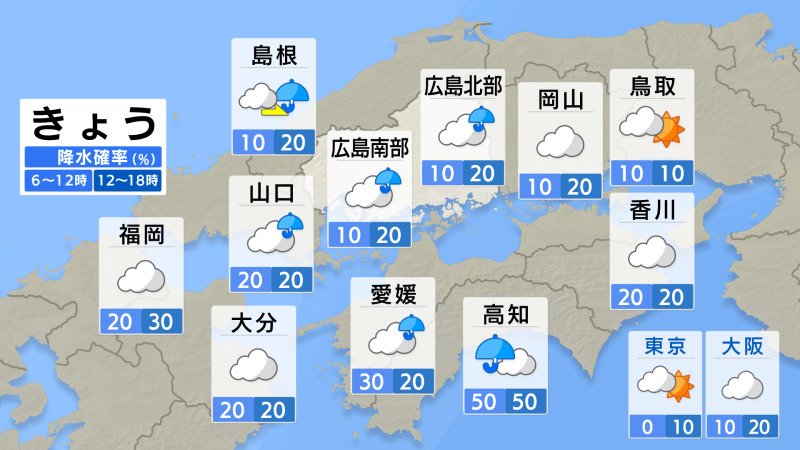 きょう17日(金)の広島県内の朝は、どんより雲が広がっていて、小雨がパラつきました。午前8時現在、東部の福山市では雨が降っています。
