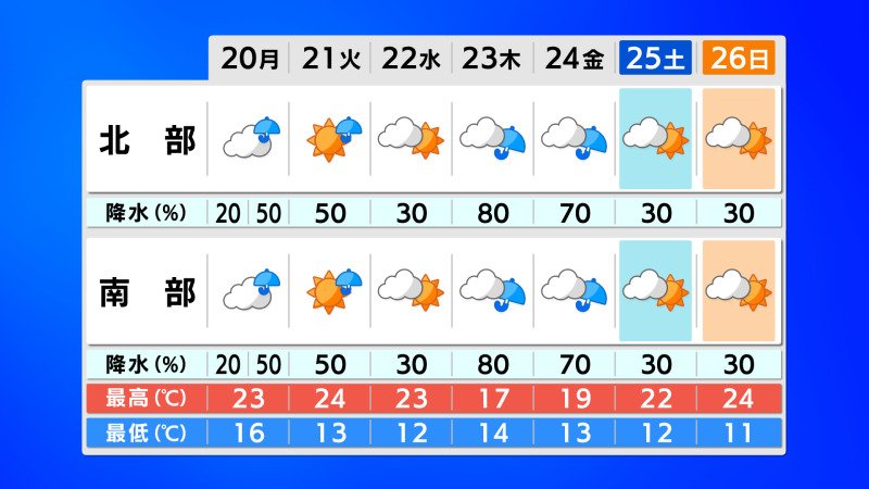 日中の予想最高気温は、22~24℃。日ざしが乏しい分、25℃を超えることはない見込みですが、湿度がやや高い分、外ではジメッと感じられるでしょう。