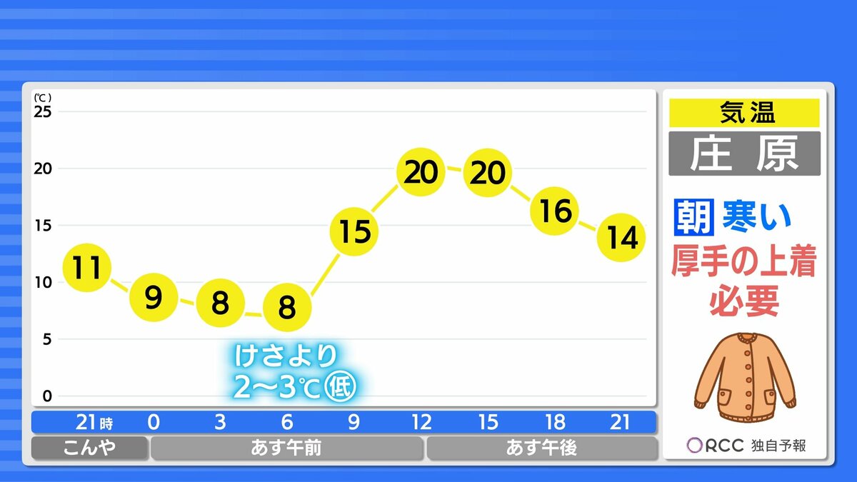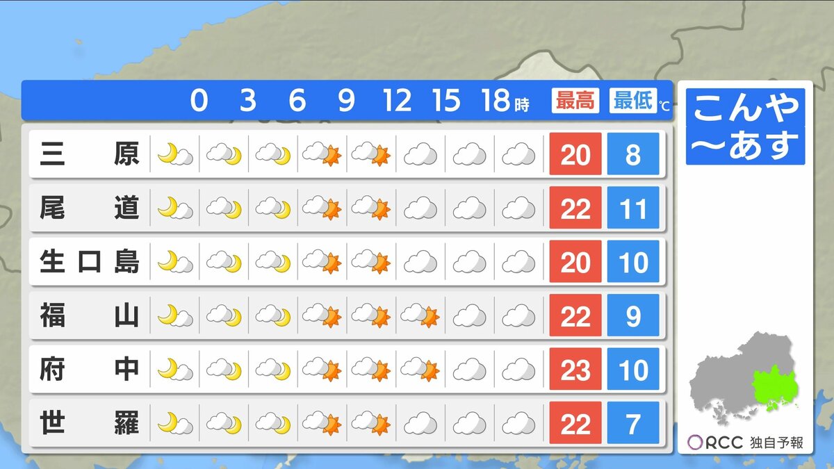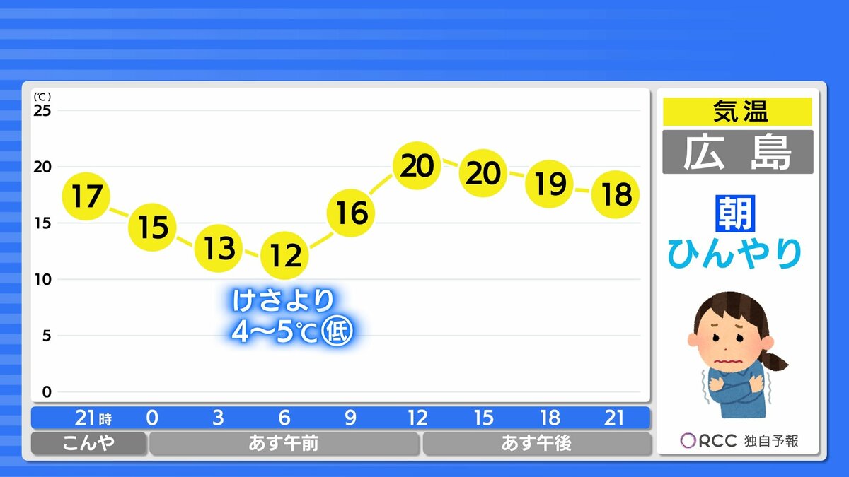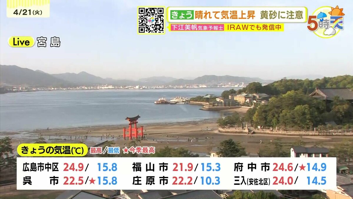 きょう21日(火)の広島県内は、明け方まで一時的に雨が降った地点がありましたが、日中はよく晴れました。日中の気温は、広島市中区で24.9℃まで上がり、朝の冷え込みも弱く、複数地点で今季一番暖かい朝になりました。