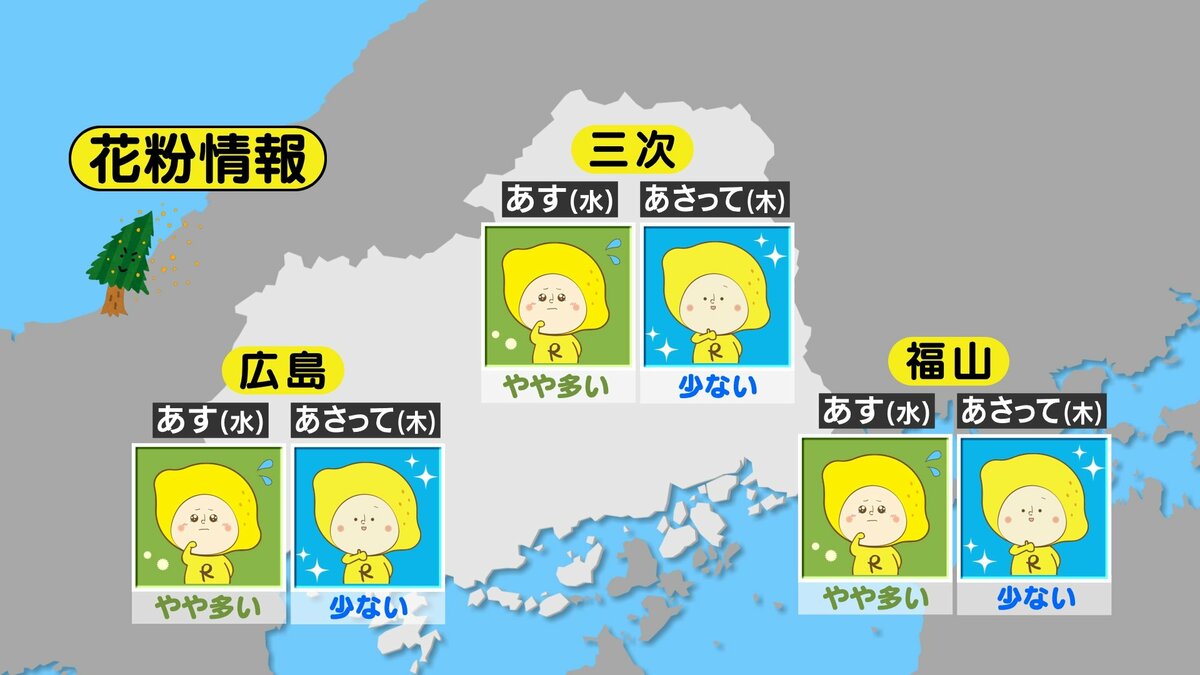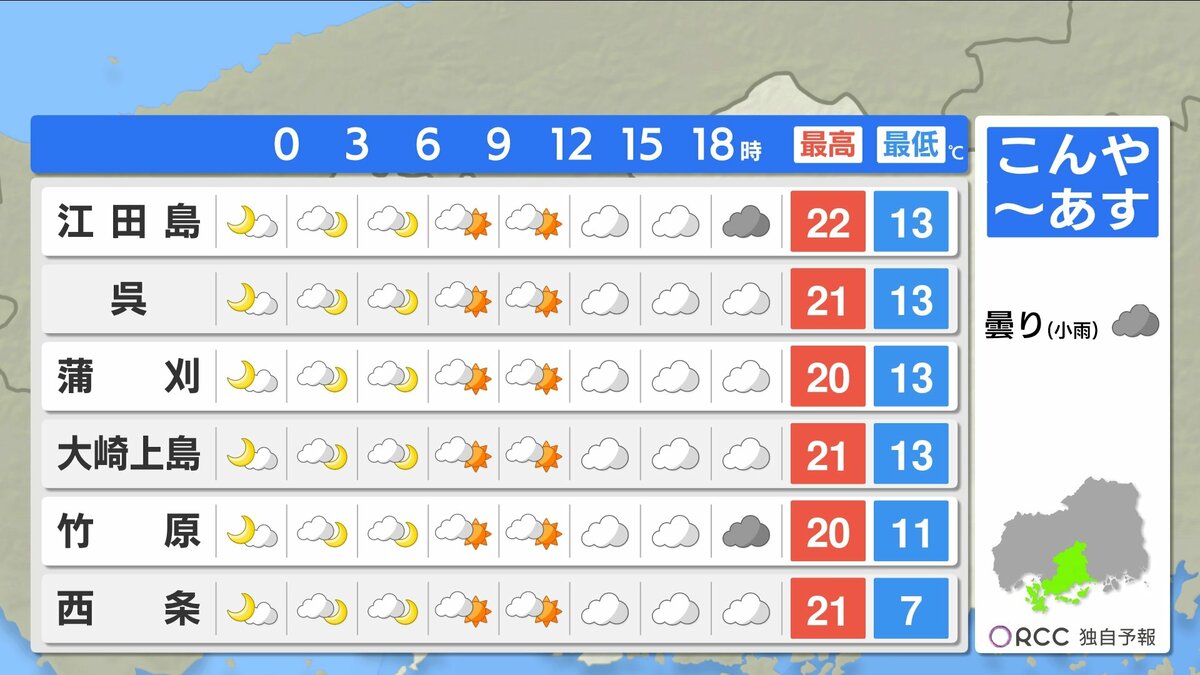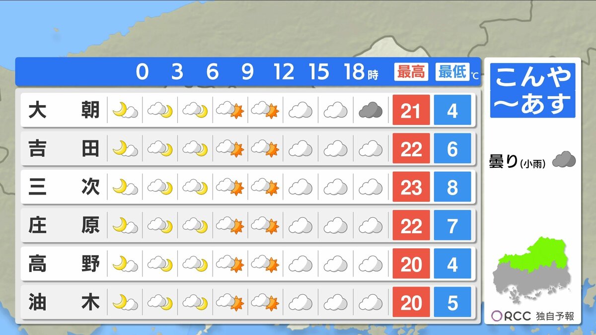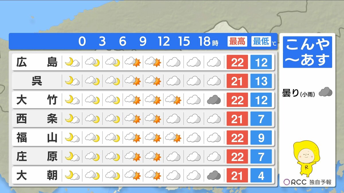 きょう21日(火)の広島県内は、明け方まで一時的に雨が降った地点がありましたが、日中はよく晴れました。日中の気温は、広島市中区で24.9℃まで上がり、朝の冷え込みも弱く、複数地点で今季一番暖かい朝になりました。