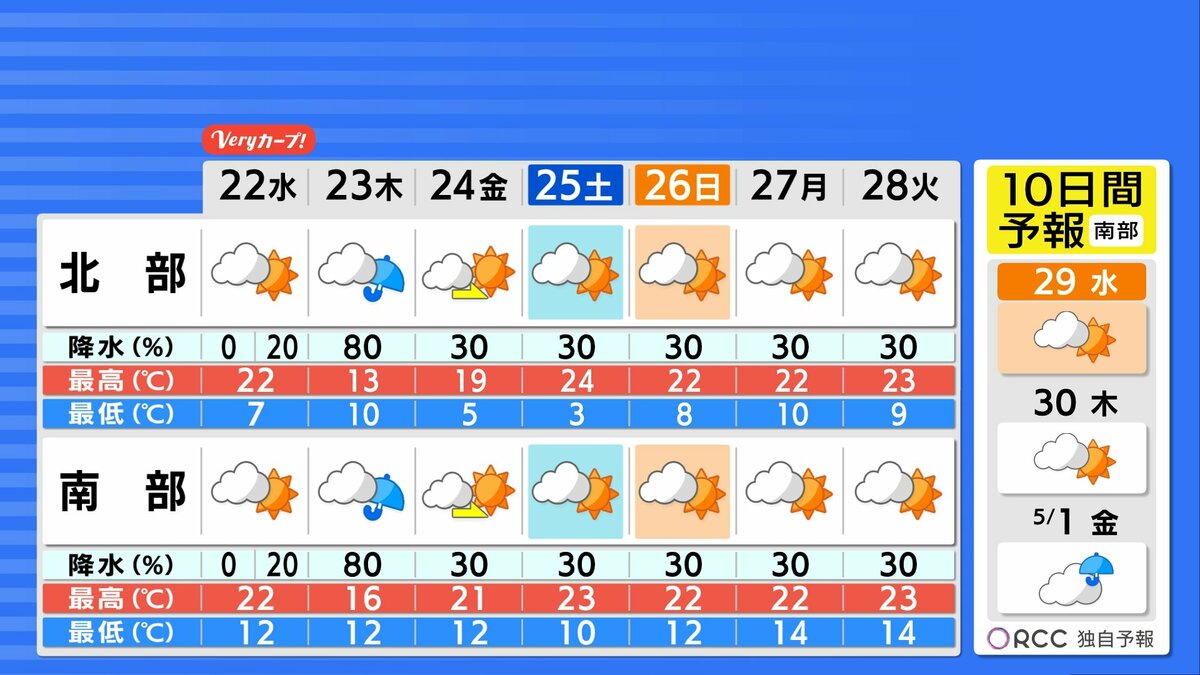 木曜日は低気圧や前線の影響でまとまった雨が降る見込みです。金曜日以降晴れ間が広がり、週末はおおむね晴れるでしょう。日中の気温は、南部で晴れると20℃を大きく超えますが、木曜日は雨が降り気温大幅ダウンとなりそうです。体調管理にはご注意ください。