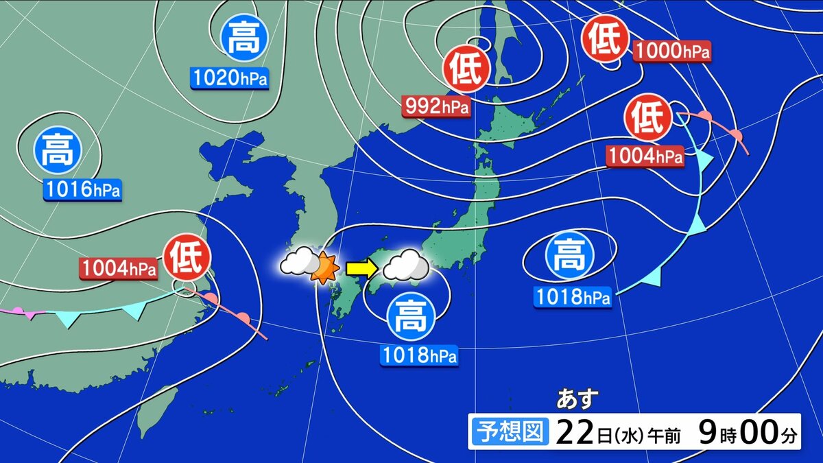 22日(水)雲が広がりやすい一日 午後ほど雲厚く 朝やや冷える 黄砂に注意