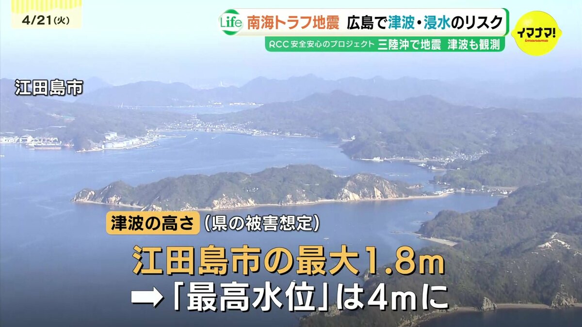 広島県内で予想される津波で最も高いのは、江田島市の最大1.8メートル。潮位の変化を加味した「最高水位」は、4メートルに達します。