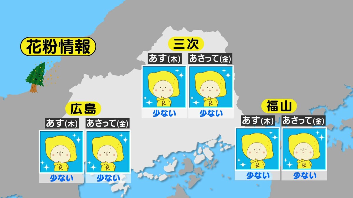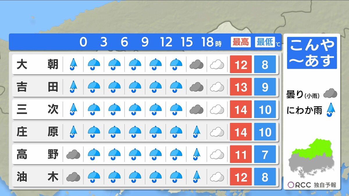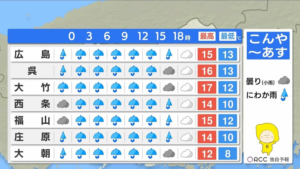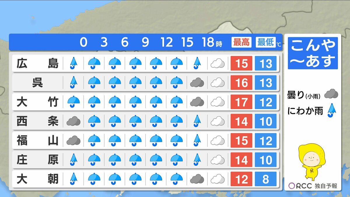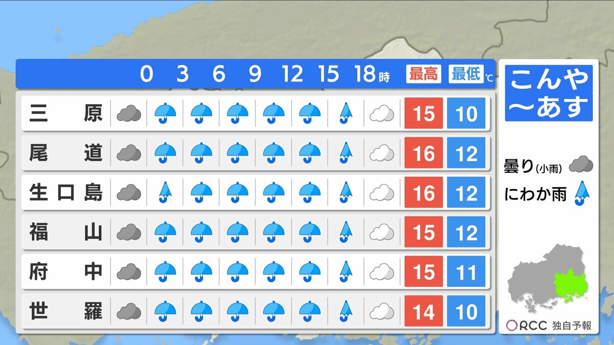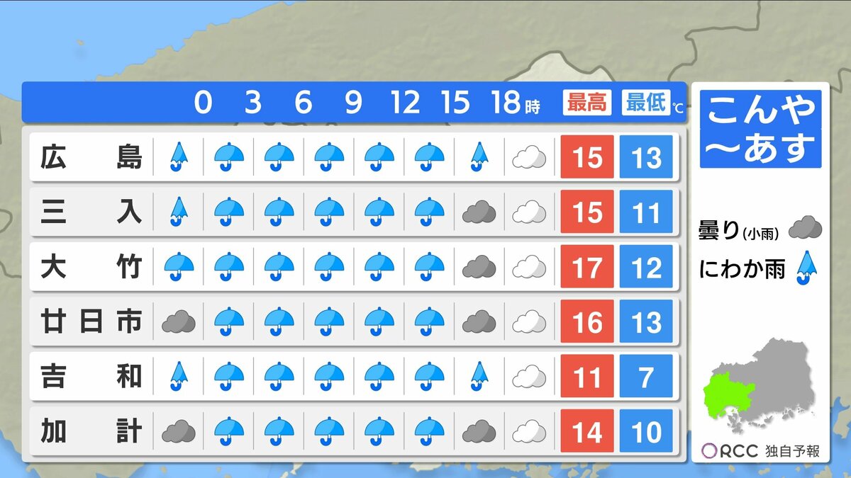 きょう22日(水)の広島県内は、曇り空で夕方からは弱い雨が降ったところもありました。日中の気温は、20℃を超えた地点は府中市・福山のみで、きのうと比べると2℃~6℃ほど低くなりました。