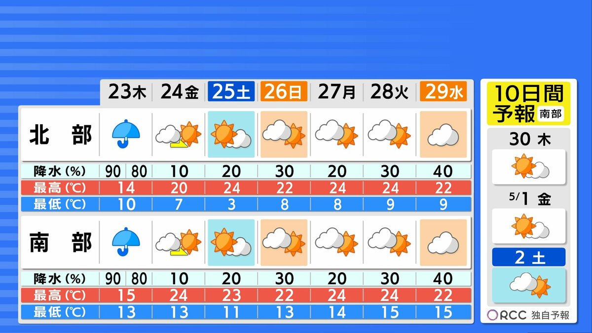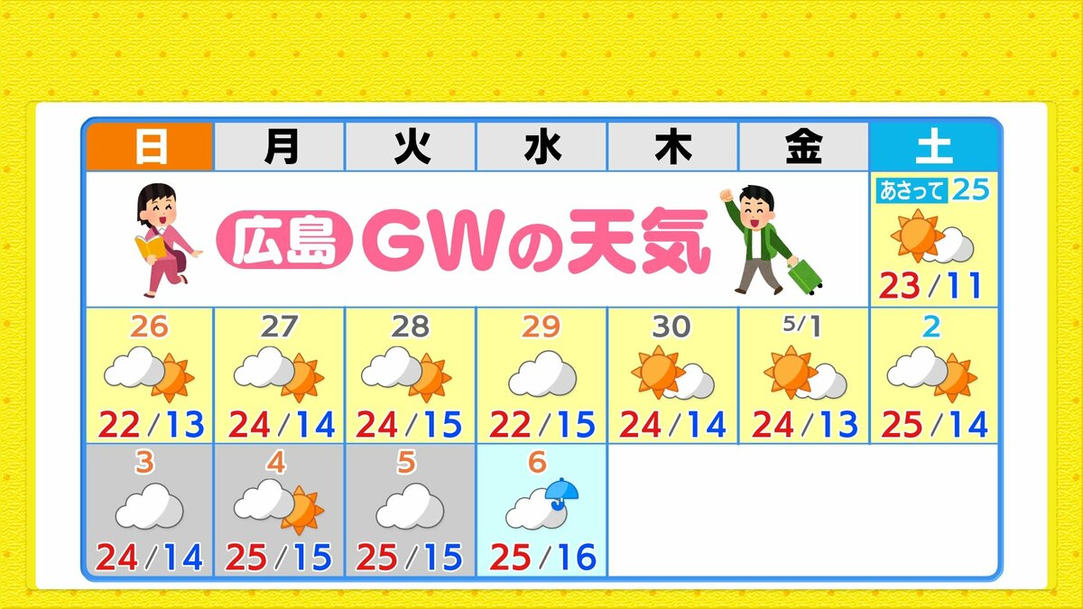 金曜日以降晴れ間が広がり、ゴールデンウィーク前半は行楽日和が多いでしょう。日曜日と来週水曜日はすっきりしない見込みで、雨が降る可能性があります。日中の気温は、晴れると20℃を大きく超えますが、あすは雨が降り気温大幅ダウンとなります。短期間に気温変化が大きくなっています。体調管理にはご注意ください。