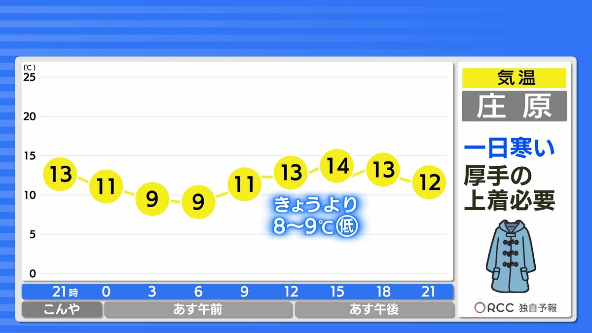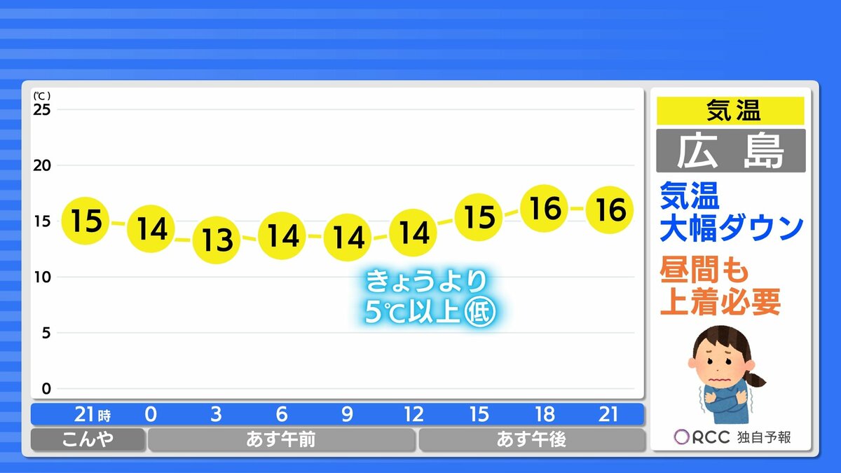 あすは朝から気温がほとんど変わらず、日中の気温は、15℃前後できょうより5℃~6℃ほど低くなります。北風が強く体感はかなり肌寒くなりそうです。上着必須の一日になるでしょう。