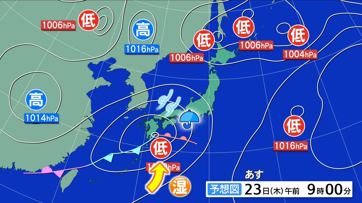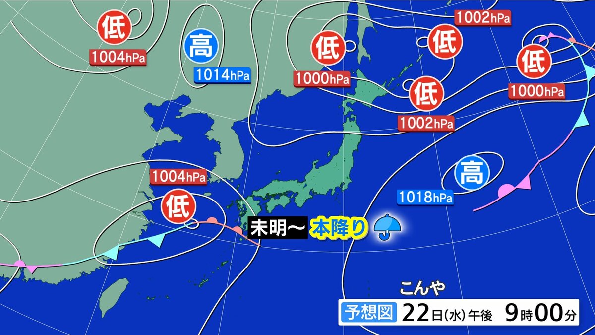 本州付近を低気圧や前線が進み、南からは暖かく湿った空気が流れ込みやすくなります。夕方にかけて本降りの雨になるでしょう。北風が強まり、横殴りの時間帯がある見込みです。あすは大きめの傘がおすすめです。夜には次第に雨は止むでしょう。