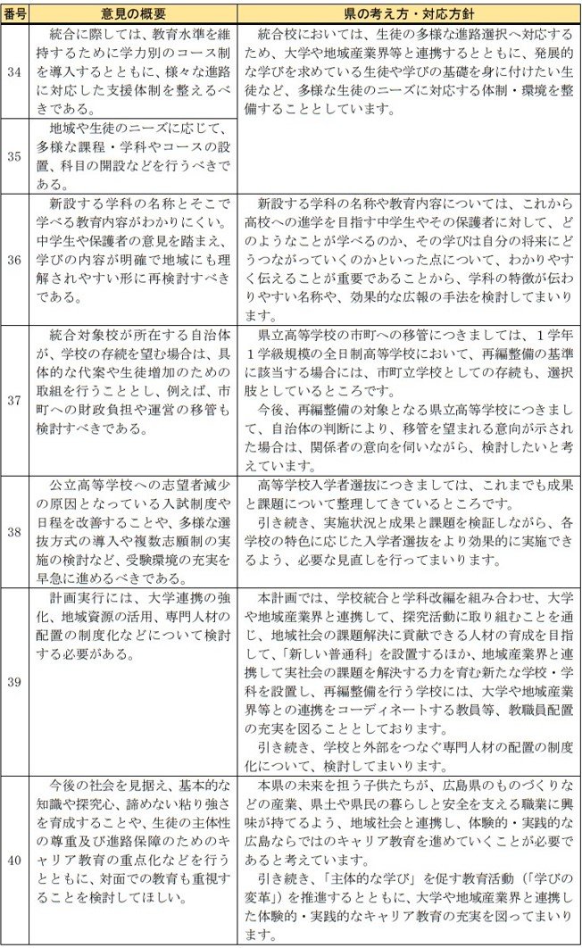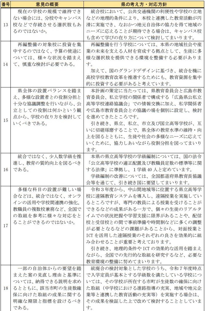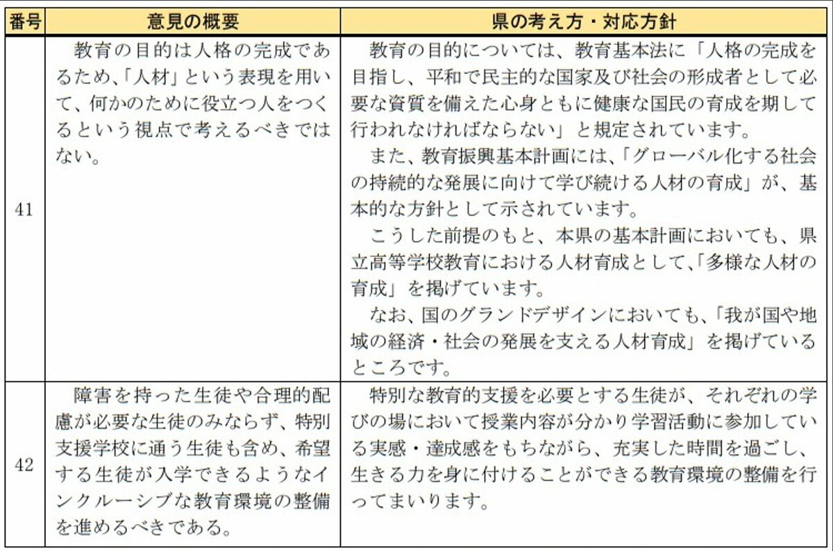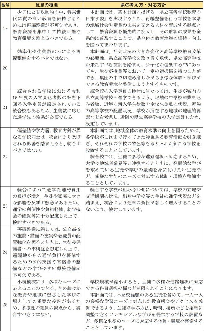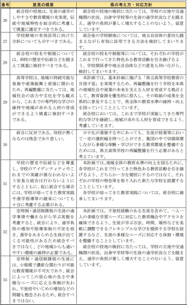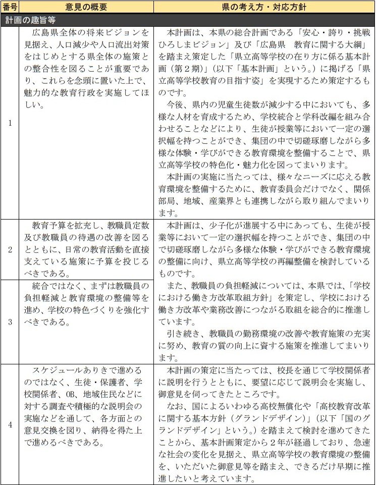 寄せられた意見では「学校の歴史を尊重し、安易な統合はすべきでない」「スケジュールありきとせず、生徒・保護者や地域住民の納得を得るべき」「分校やキャンパスとしての存続も検討すべき」など、見直しを求める意見が目立ちました。