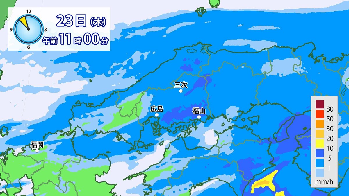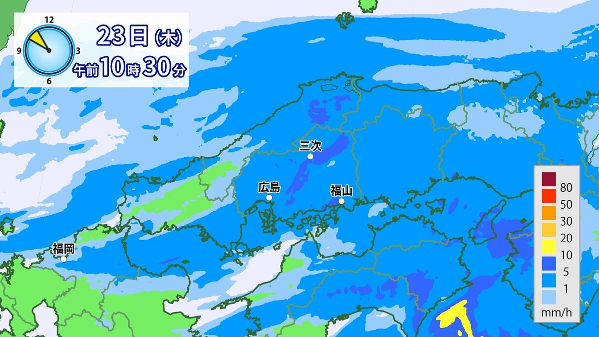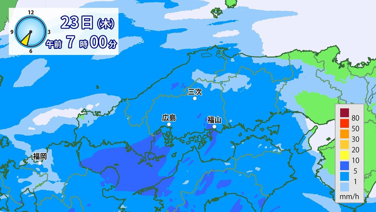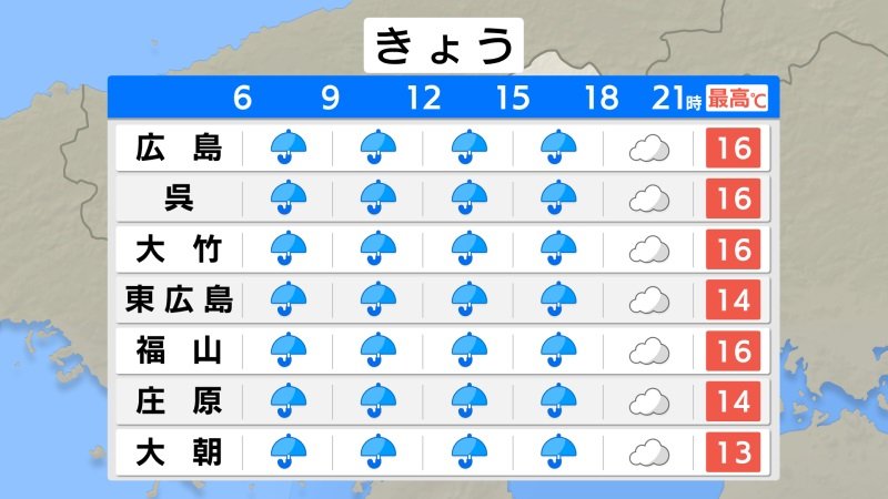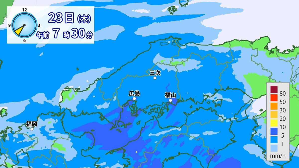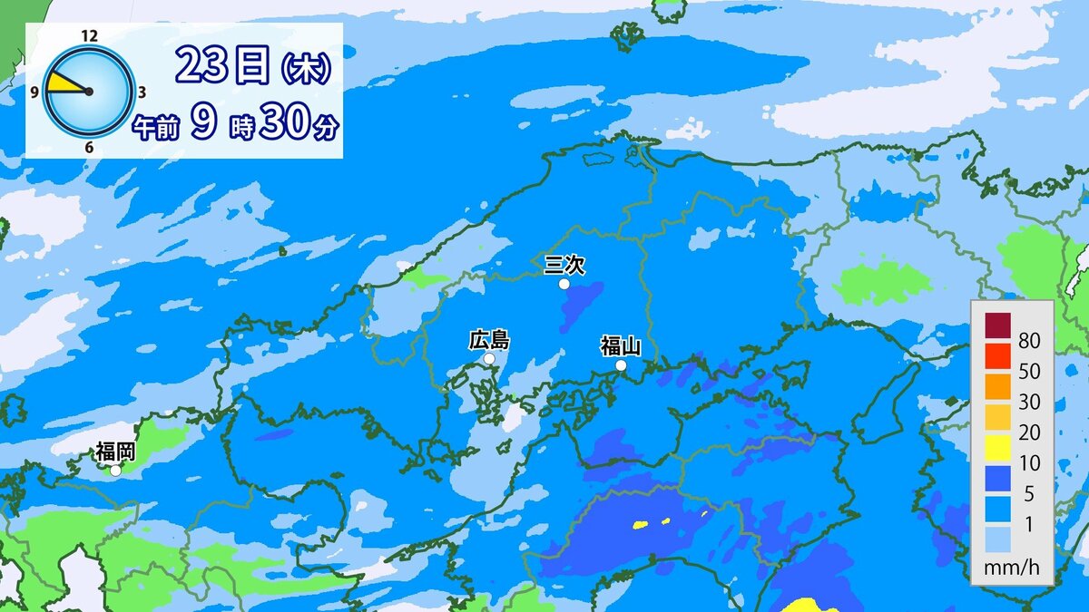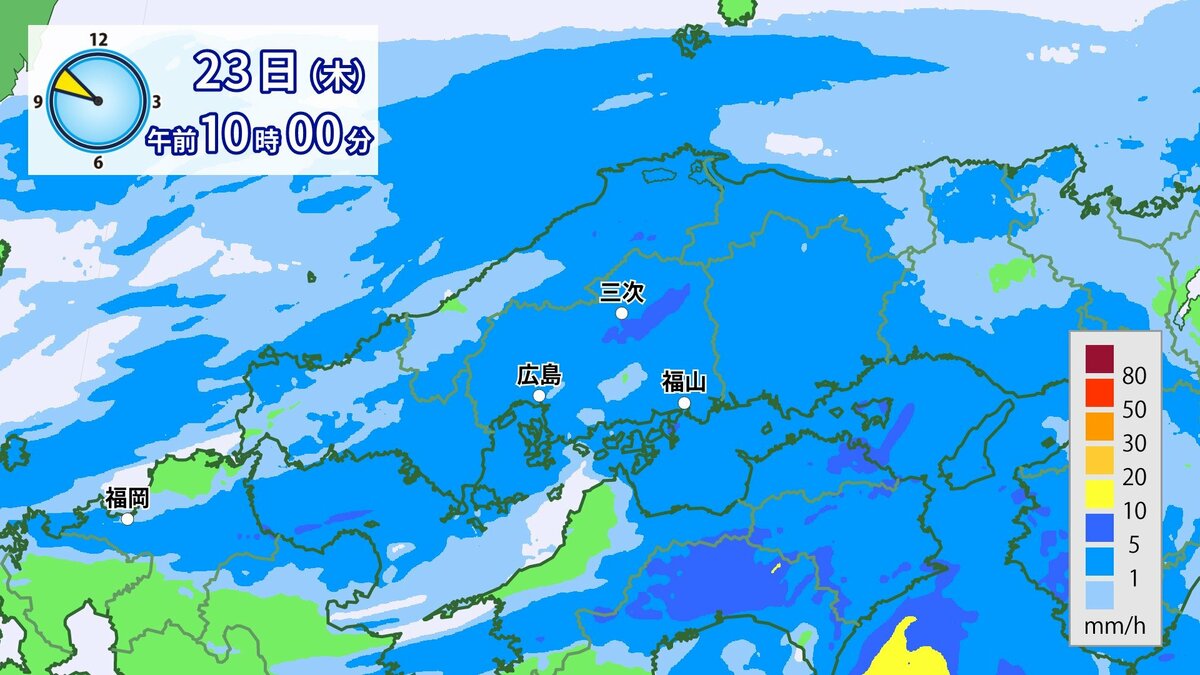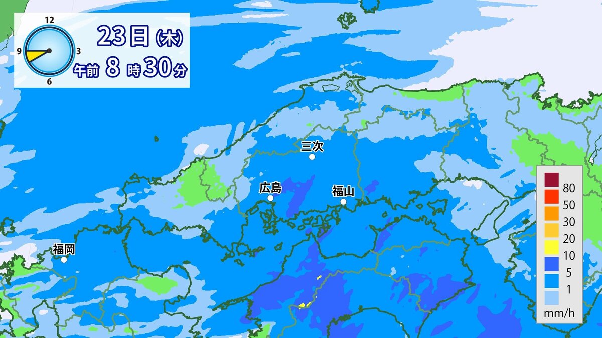 きょう23日(木)の広島県内の朝は、雨が降っています。朝の冷え込みは弱く、北部も含めて10℃を下回っていないところがほとんどです。