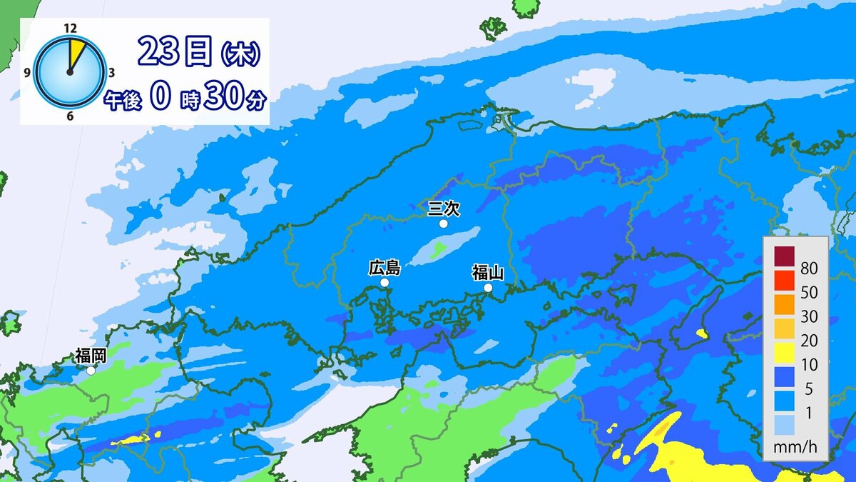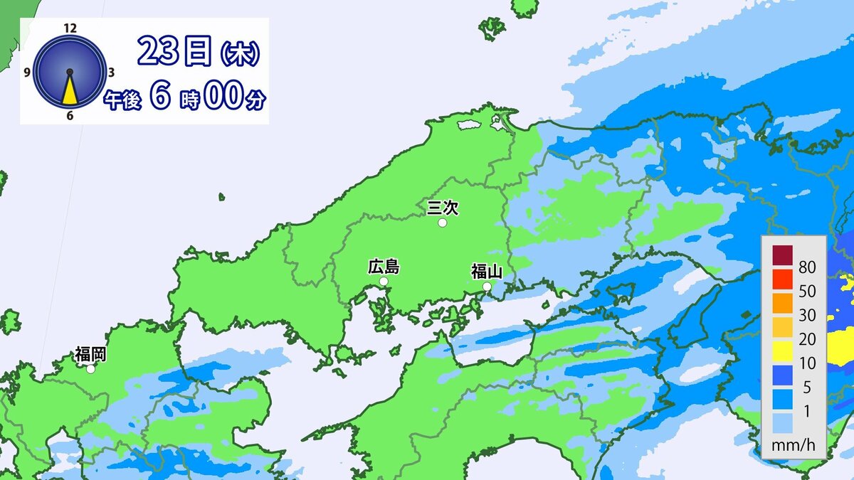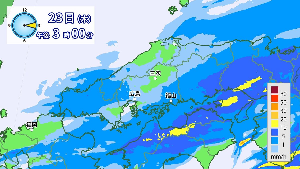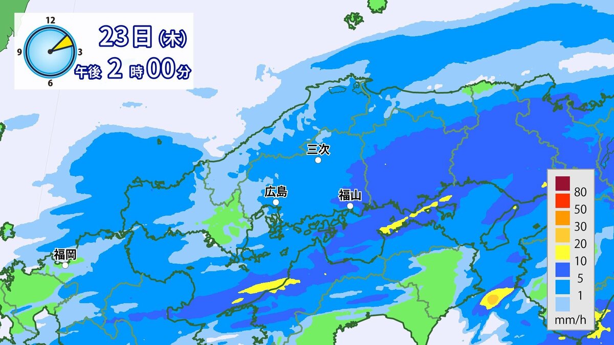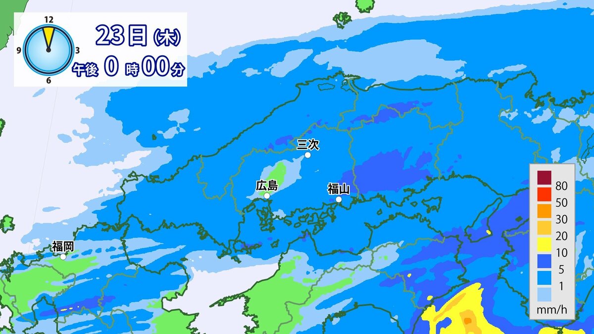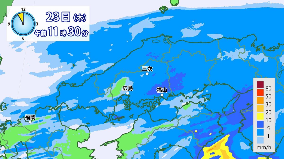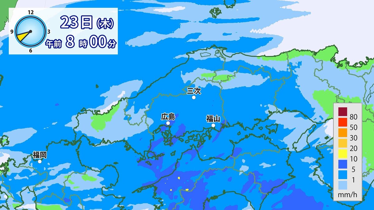 きょう23日(木)の広島県内の朝は、雨が降っています。朝の冷え込みは弱く、北部も含めて10℃を下回っていないところがほとんどです。