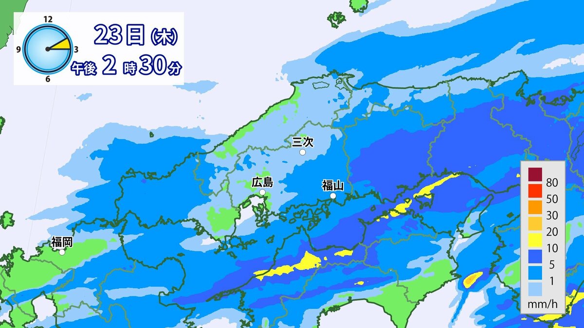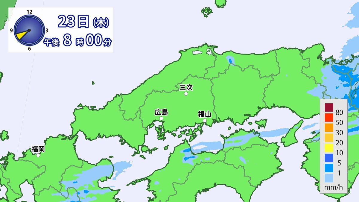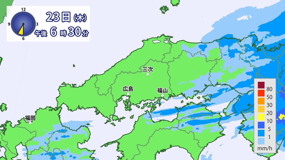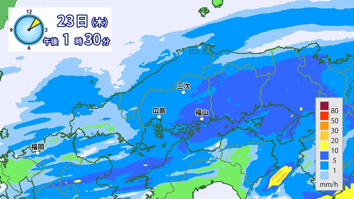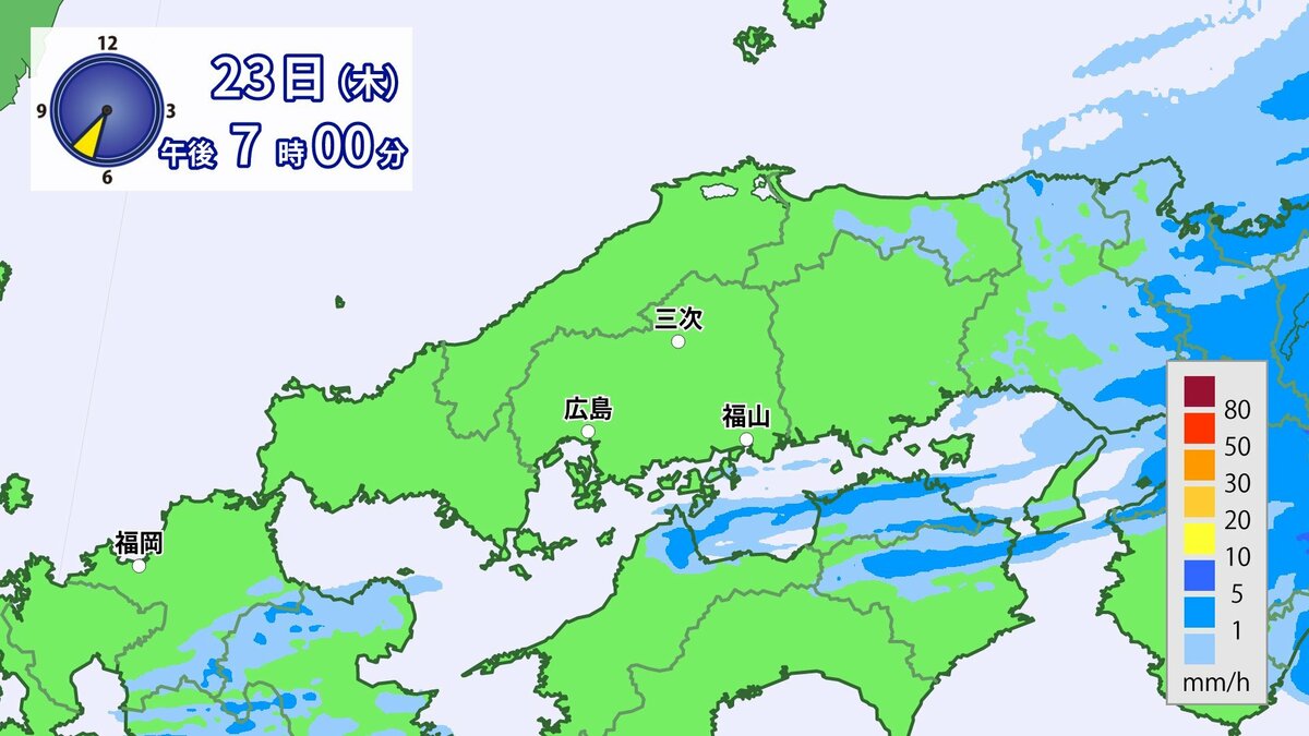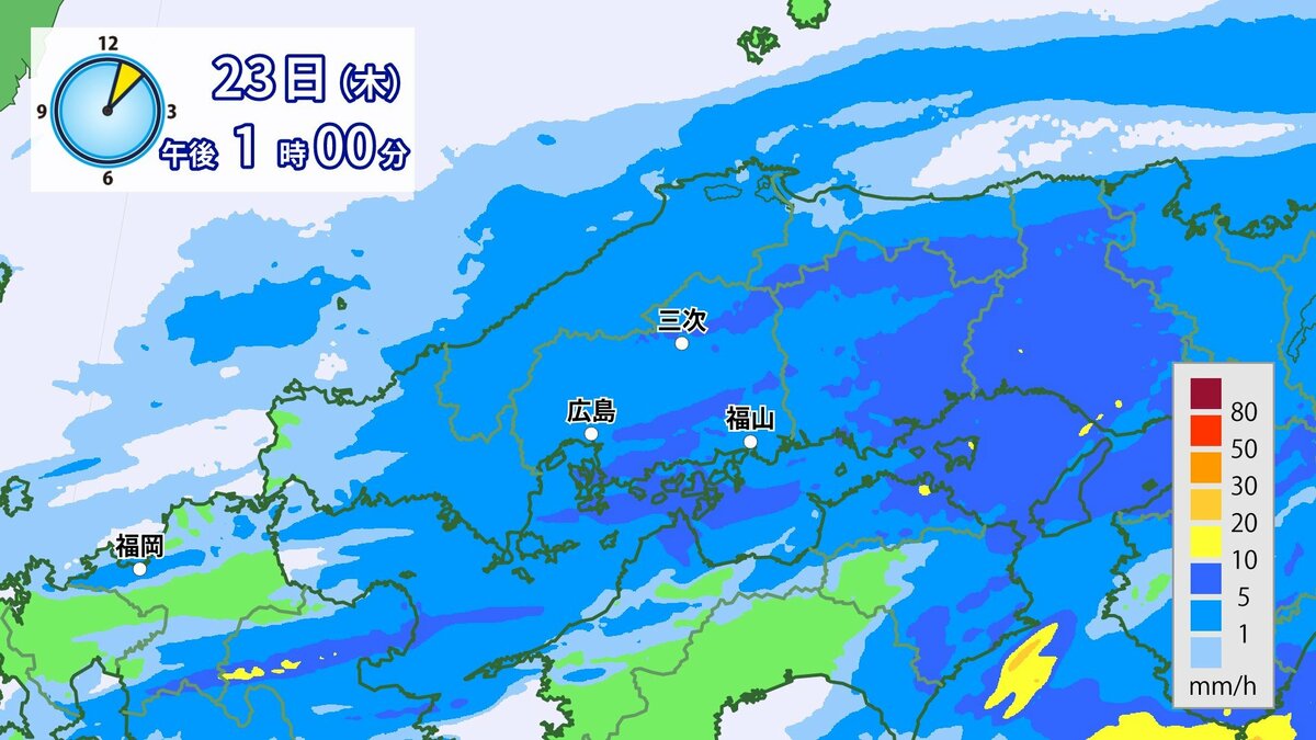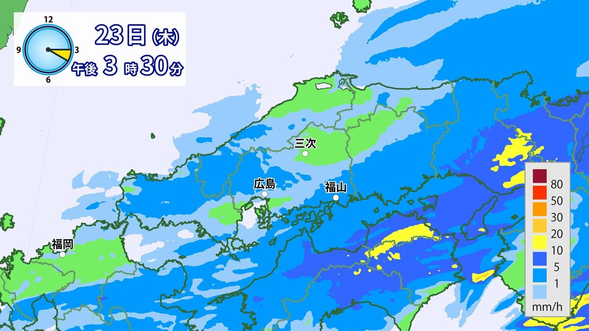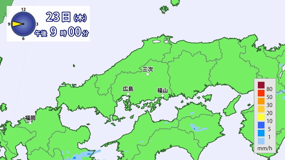 きょう23日(木)の広島県内の朝は、雨が降っています。朝の冷え込みは弱く、北部も含めて10℃を下回っていないところがほとんどです。