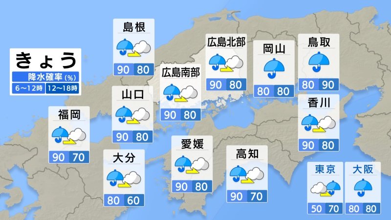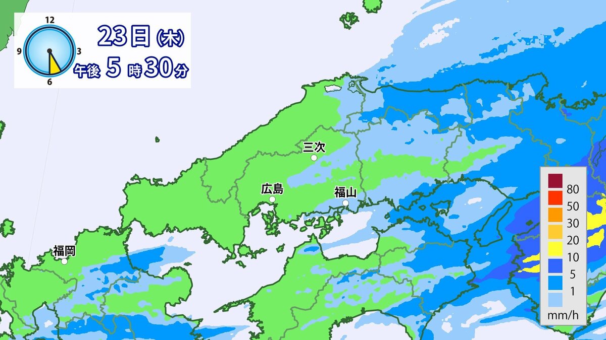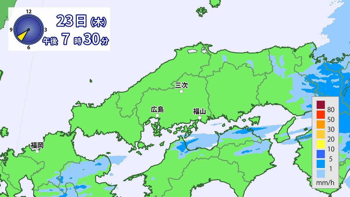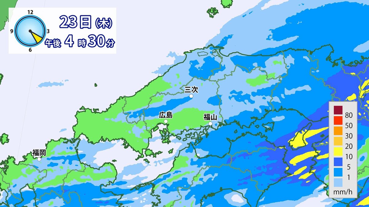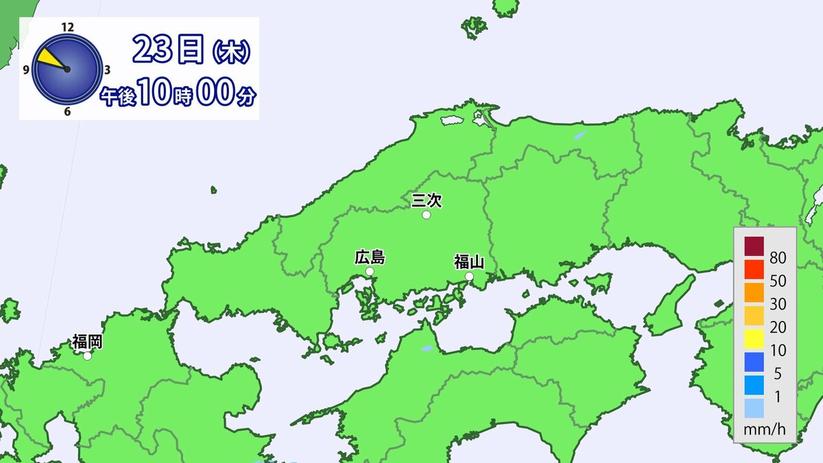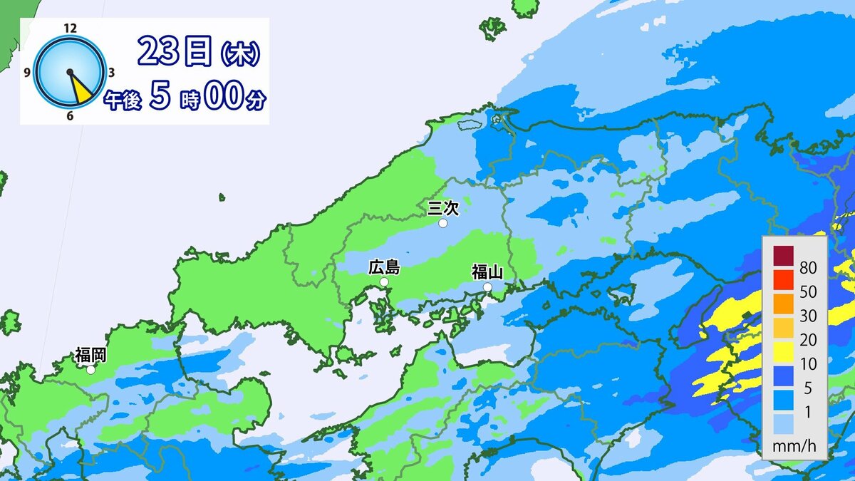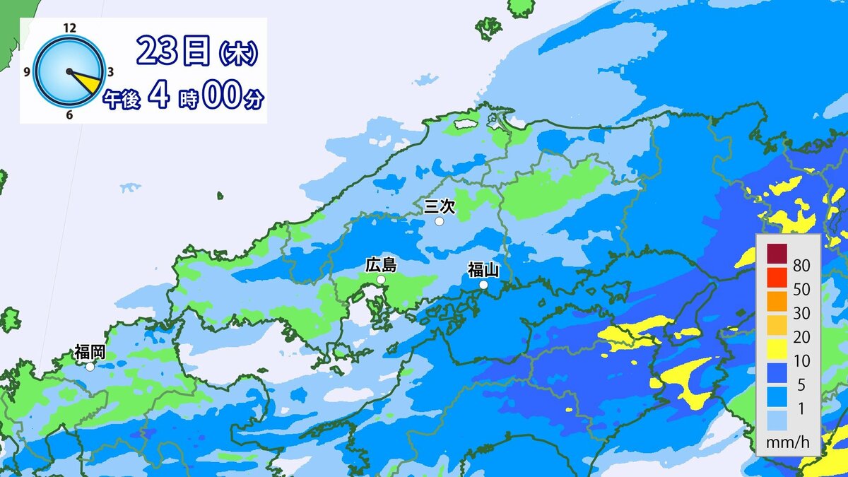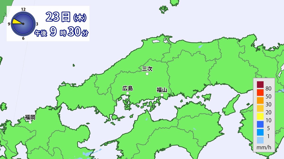 きょう23日(木)の広島県内の朝は、雨が降っています。朝の冷え込みは弱く、北部も含めて10℃を下回っていないところがほとんどです。