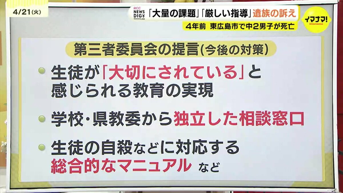 ▽生徒の自殺などに対応する総合的なマニュアルの整備などを提言しています。
