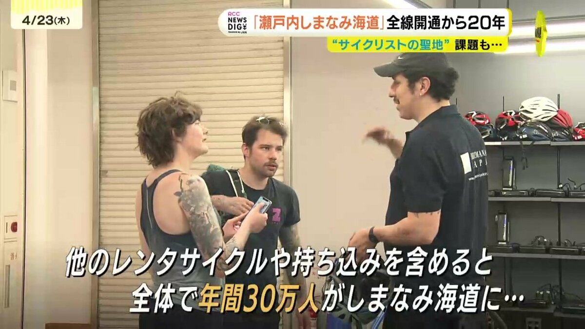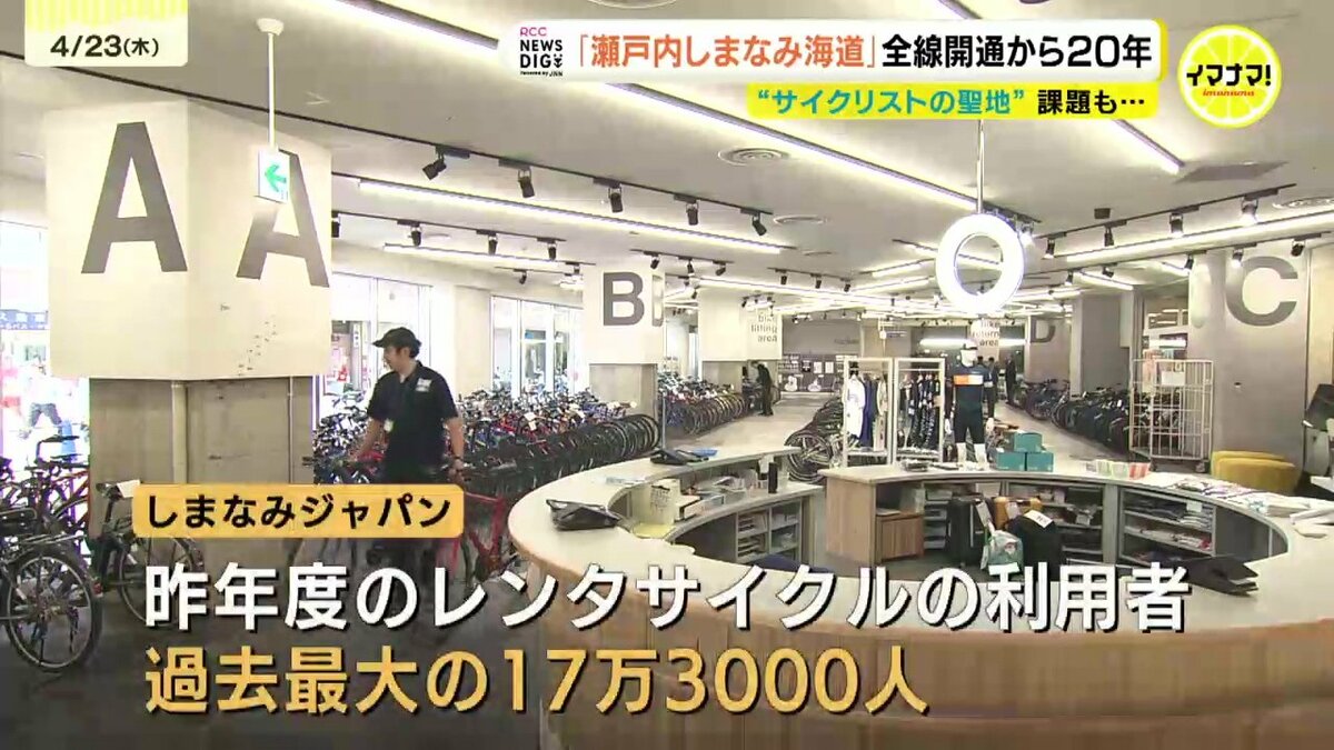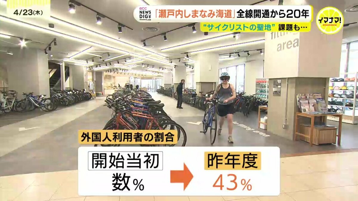 しまなみ最大のレンタサイクルを運営するしまなみジャパンによると昨年度の利用者は過去最大の17万3000人。開始当初は全体の数%ほどだった外国人利用者は今では43%となりました。他のレンタサイクルの利用や個人の持ち込みを含めると、合わせて年間30万人のサイクリストが訪れているといいます。