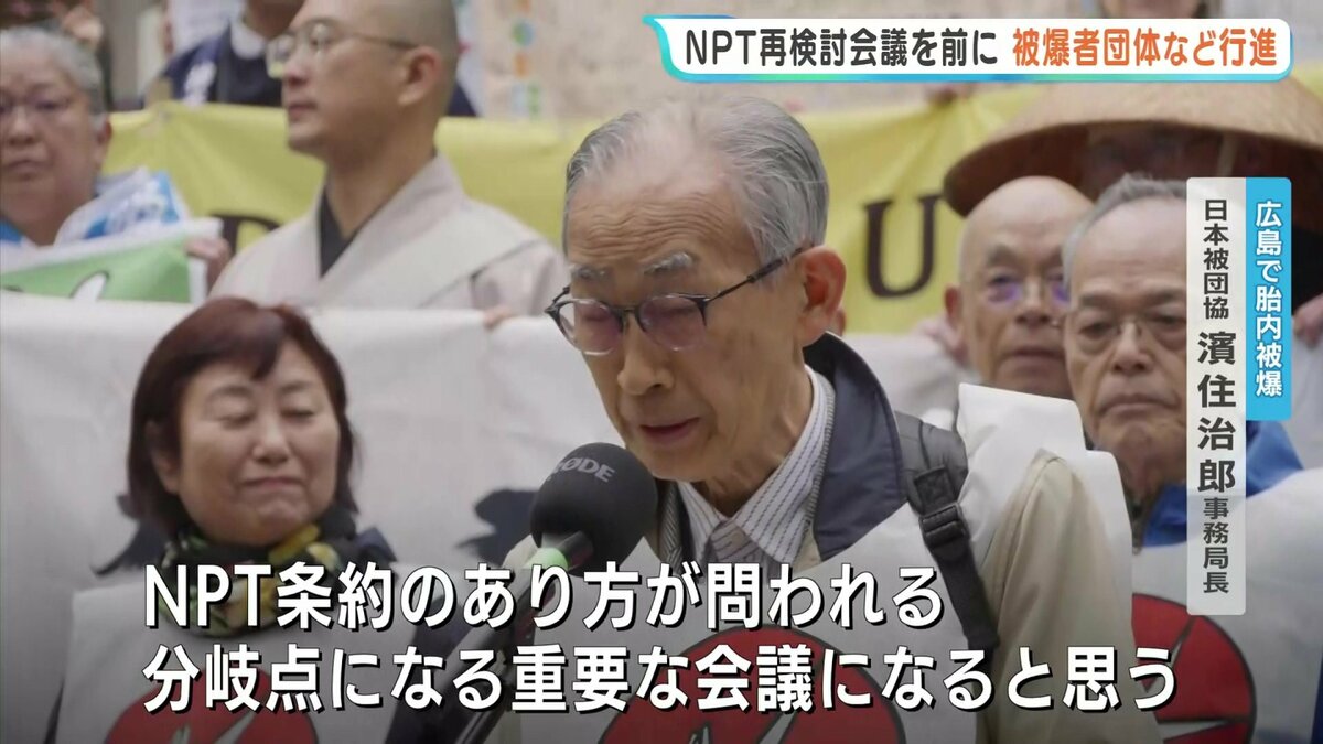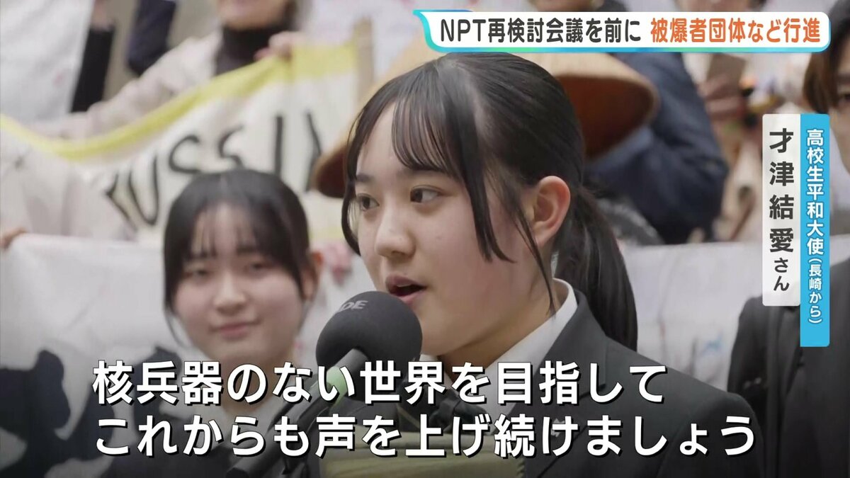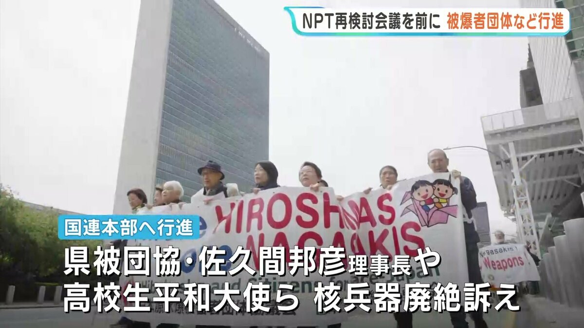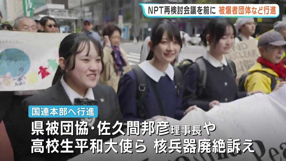 NPT=核拡散防止条約の再検討会議を前に、広島県被団協の佐久間邦彦理事長など被爆者団体や、広島・長崎から派遣された高校生平和大使3人などが、会議の会場となる国連本部まで行進し核兵器の廃絶を訴えました。