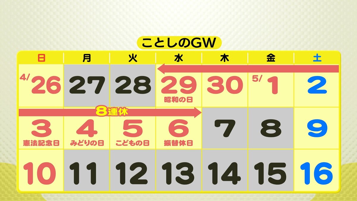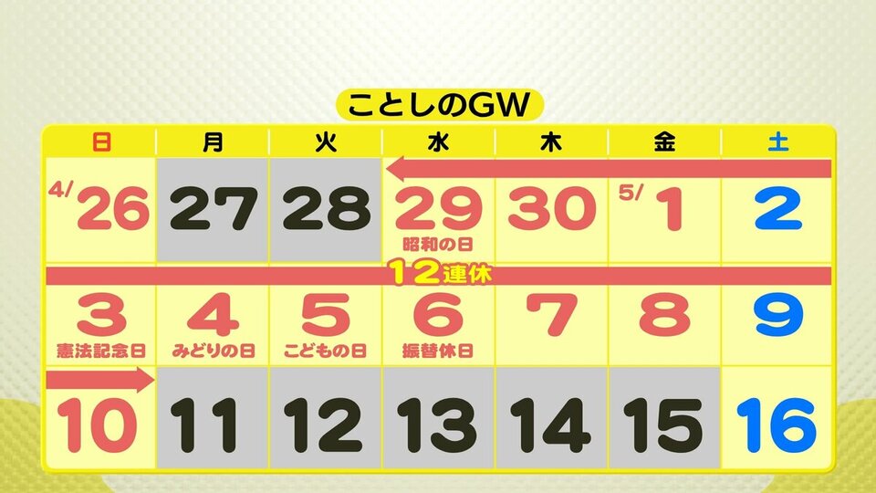 5月7日・8日も休みにすると「12連休」になり、組み合わせ次第でさらに長期連休が取りやすい暦になっています。