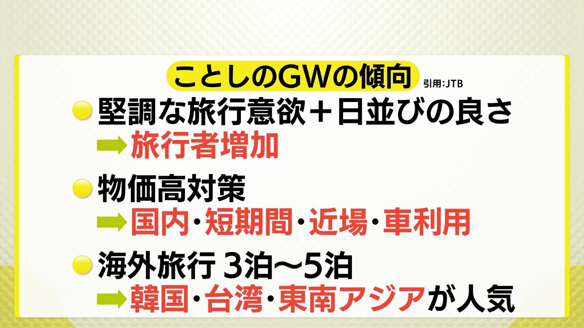 JTBによりますと、ことしのGWの傾向は「堅調な旅行意欲」と「日並びの良さ」を背景に、旅行者数は増加。
