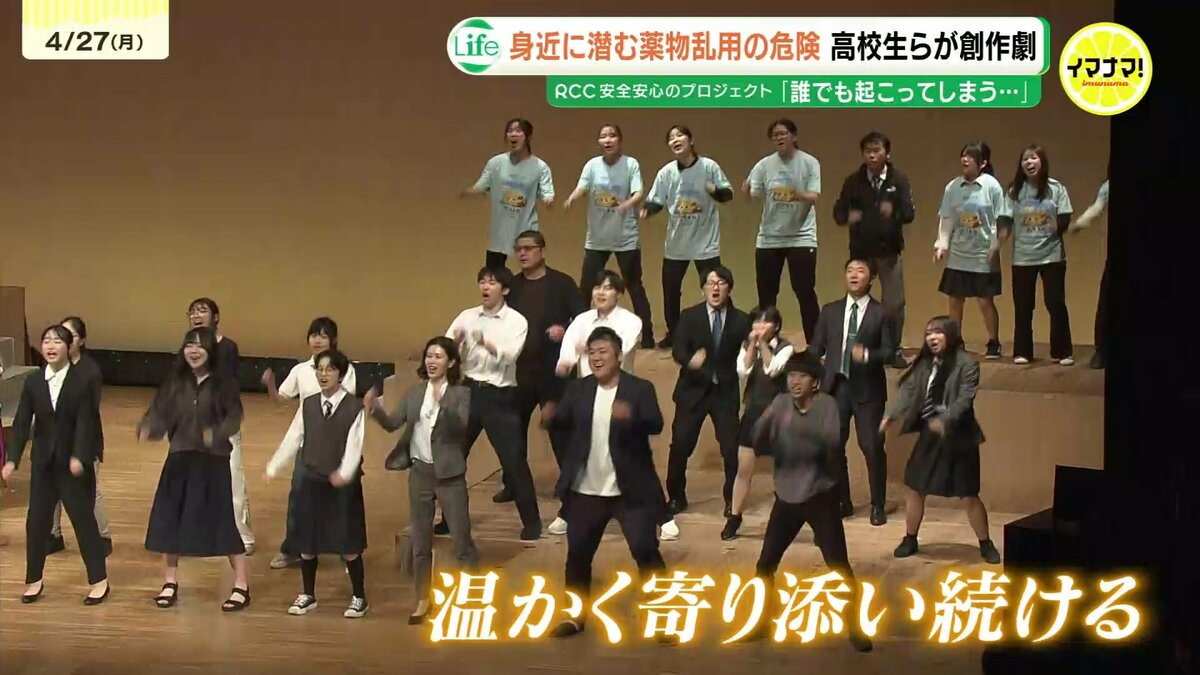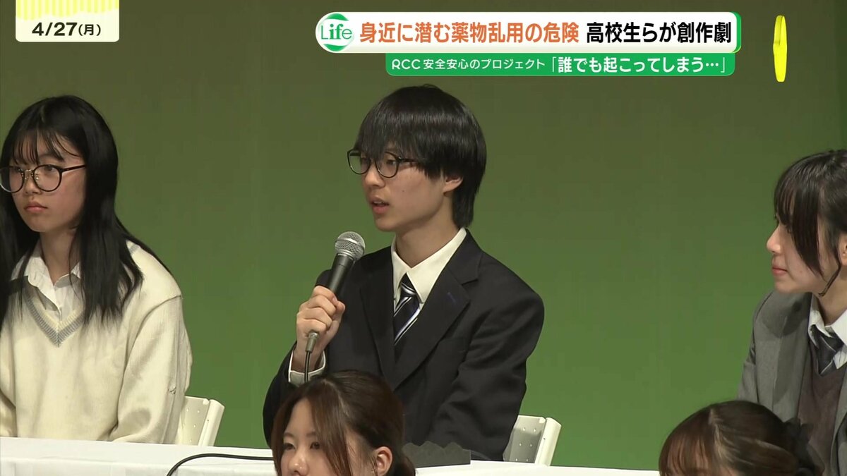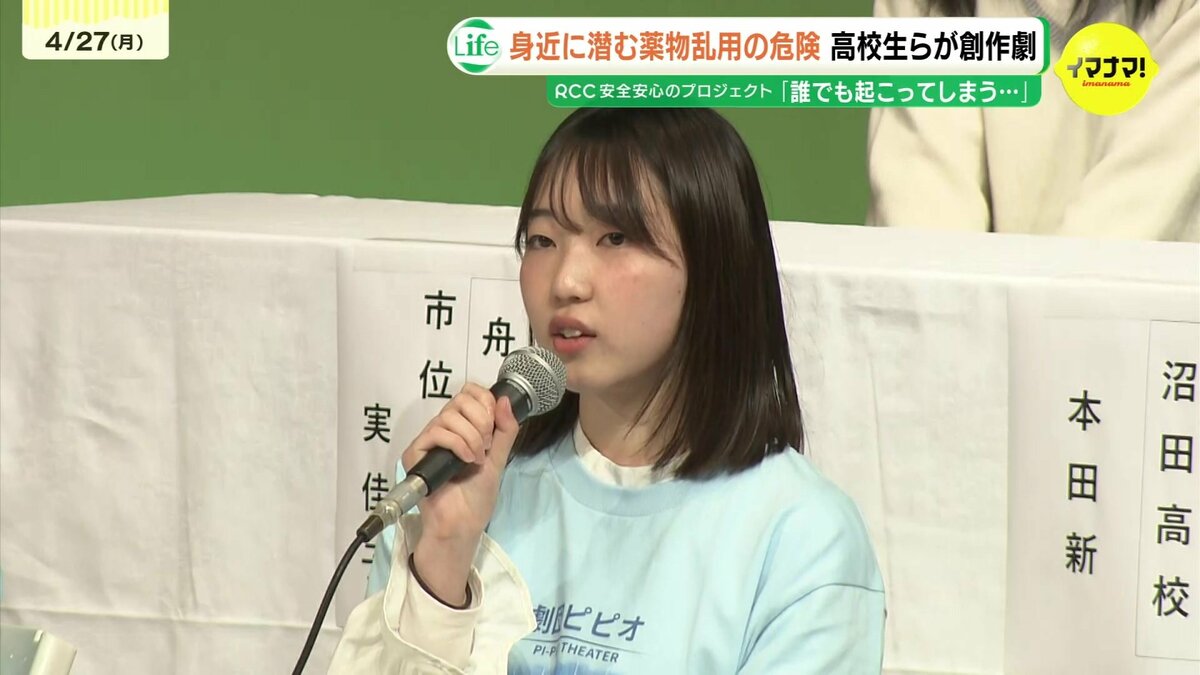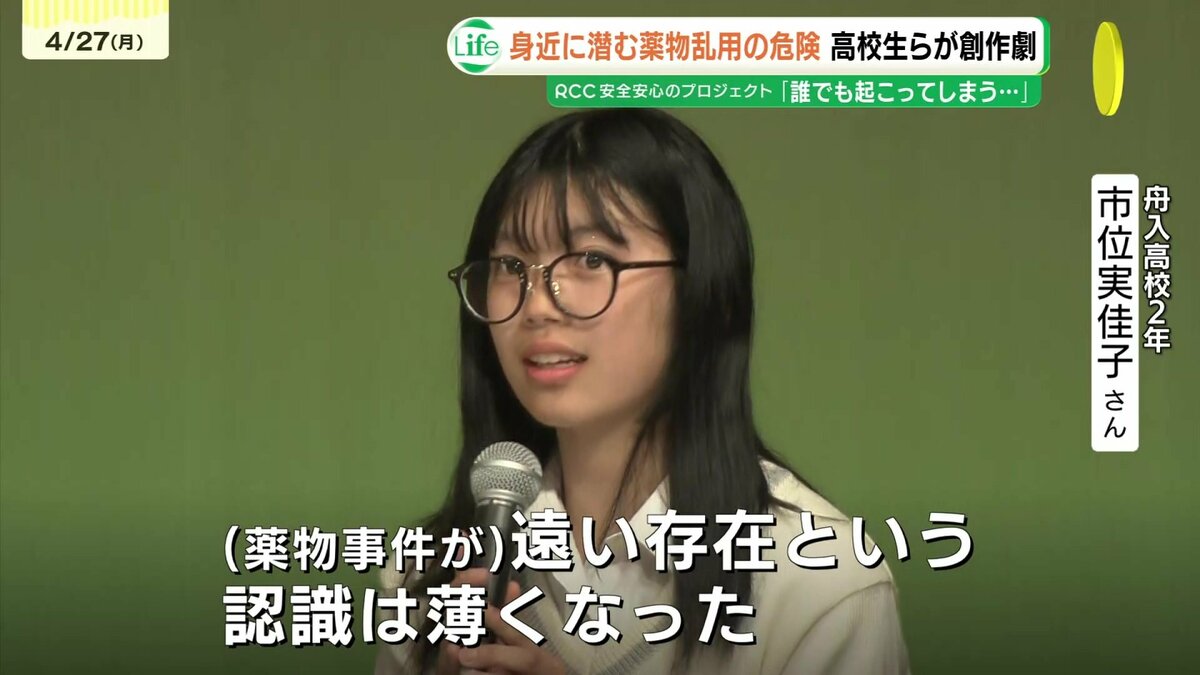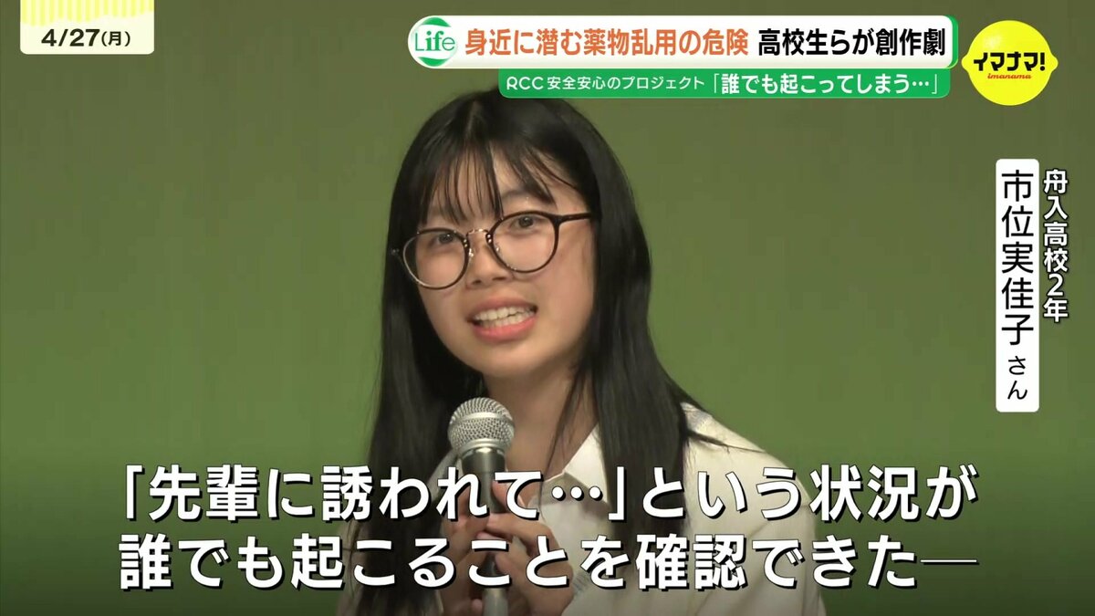 創作劇に出演した広島市立舟入高校2年の市位実佳子さんは「『先輩に誘われて薬物に関わってしまう』そんな状況が誰でも起こってしまうのを改めて確認することができた。薬物事件は遠い存在という認識が薄くなったように感じる」と話しました。