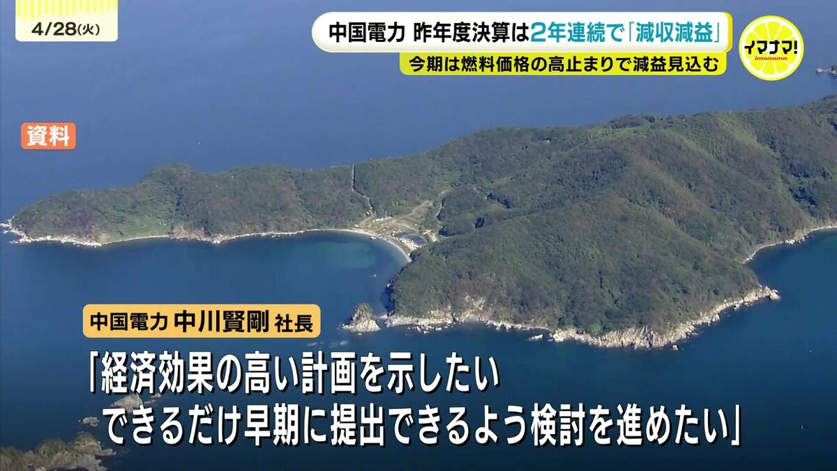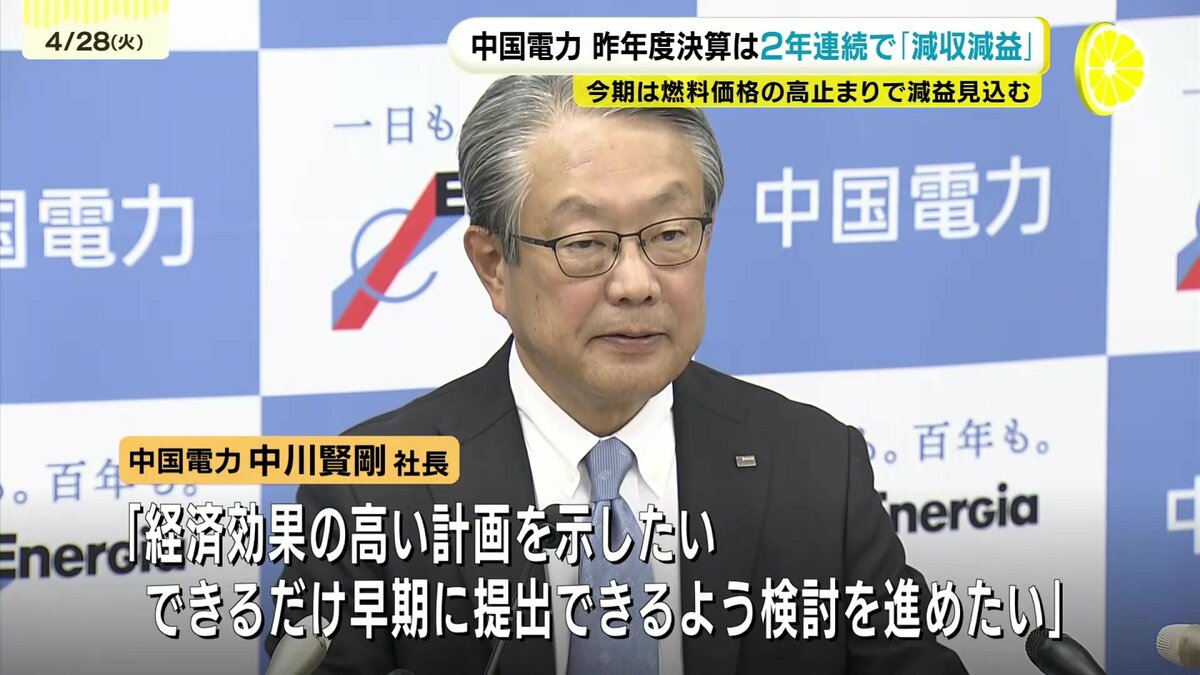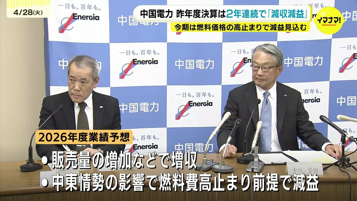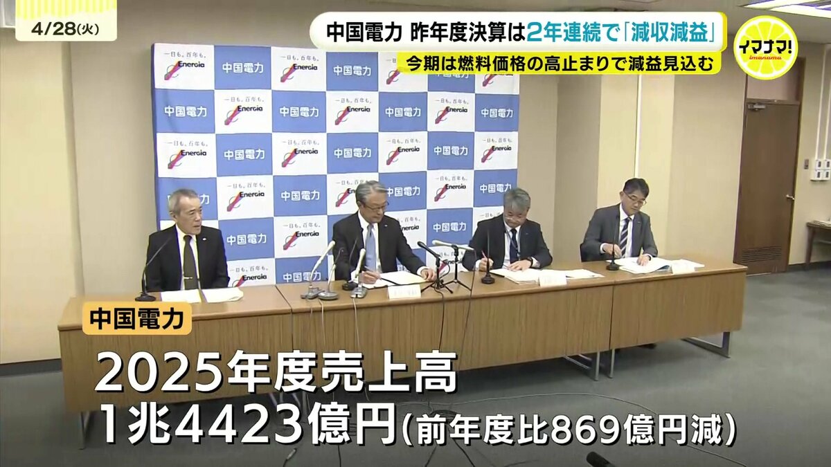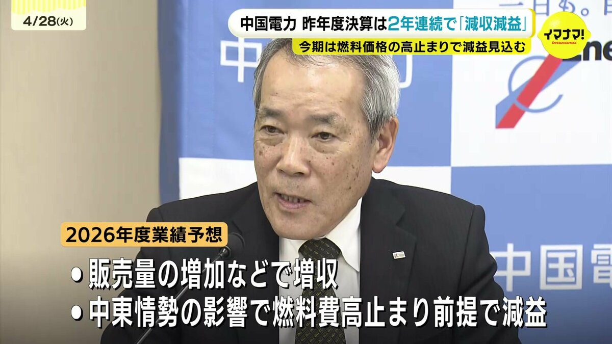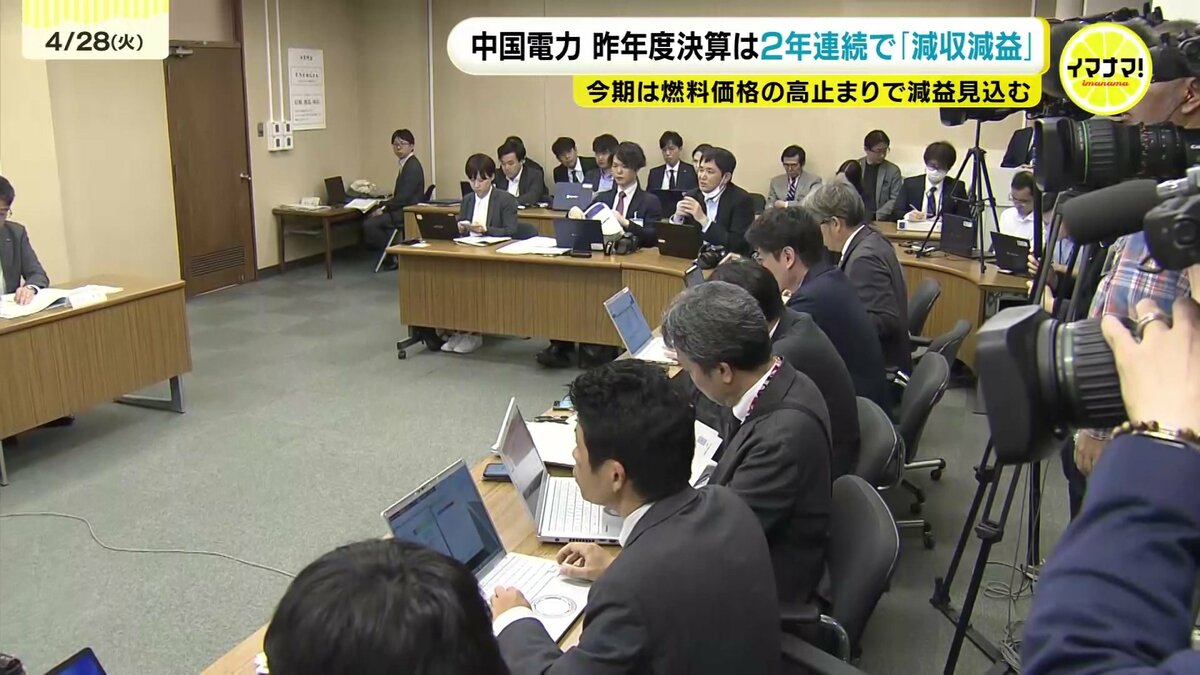 中国電力が昨年度の連結決算を発表しました。2年連続の減収減益となっています。