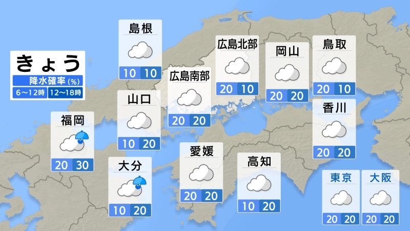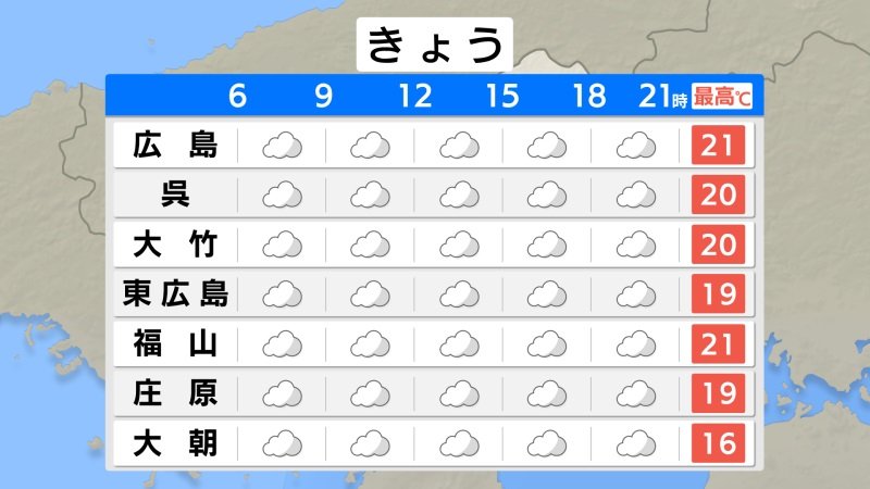 きょう29日(水)の広島県の朝は、雲が広がっています。レーダーに、雨雲が写っているところもありますが、実際には、地上に落ちるまでに蒸発して、雨として落ちていないところが多くなっています。冷え込みは弱く、最低気温は広島16.8℃、福山15.4℃、三次14.1でした。