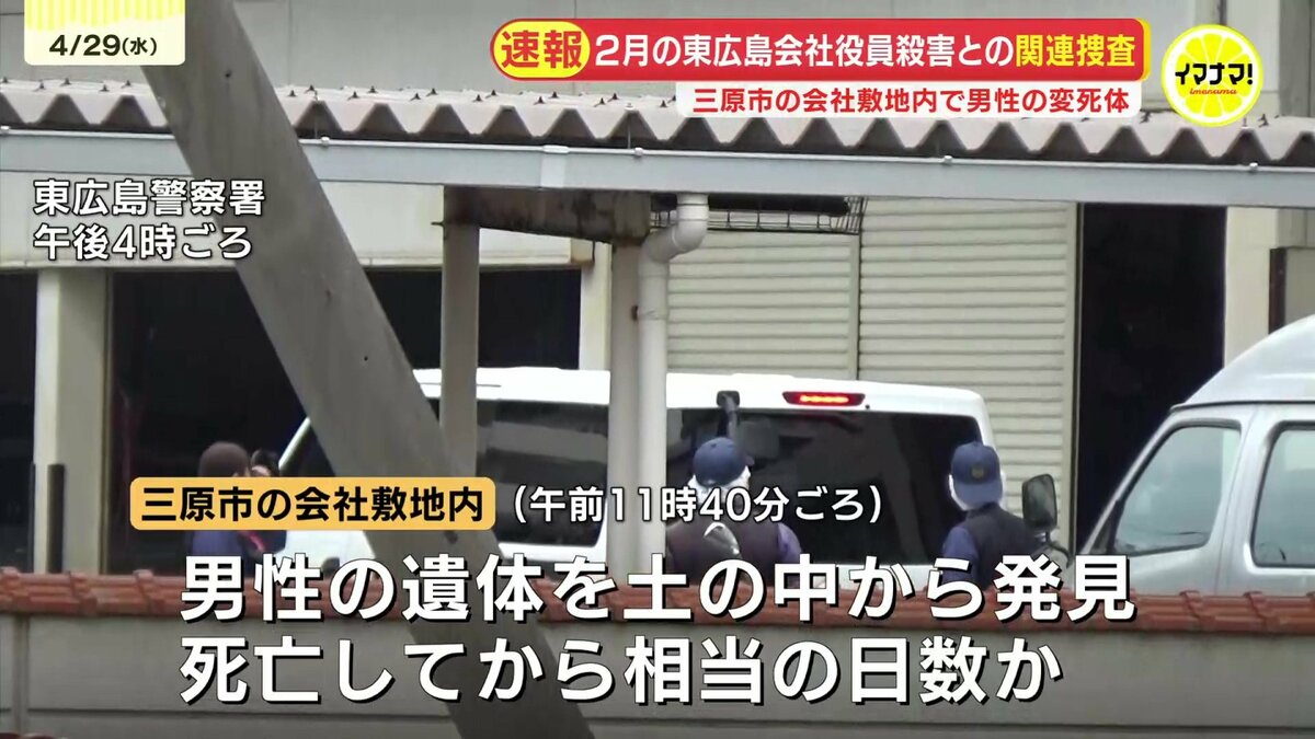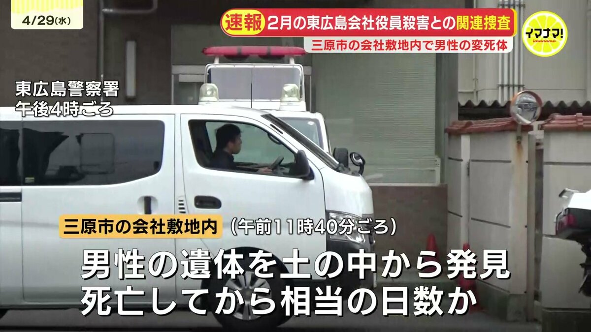 警察によりますと、29日午前11時40分ごろ、三原市沼田の会社敷地内で男性の遺体が発見されました。遺体は年齢不明で、捜査員が土の中から発見したということです。死亡してから相当の日数が経っているとみられます。