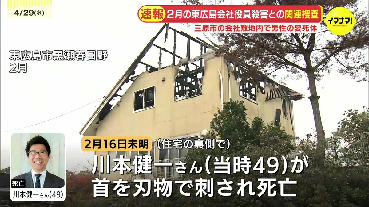 事件は2月16日未明、東広島市黒瀬春日野の住宅の裏側で、会社役員の川本健一さんが、首を刃物で刺され死亡しているのが見つかったものです。また、この住宅では火事も起き、川本さんと2人で暮らしていた妻もけがをしています。