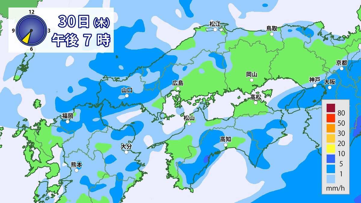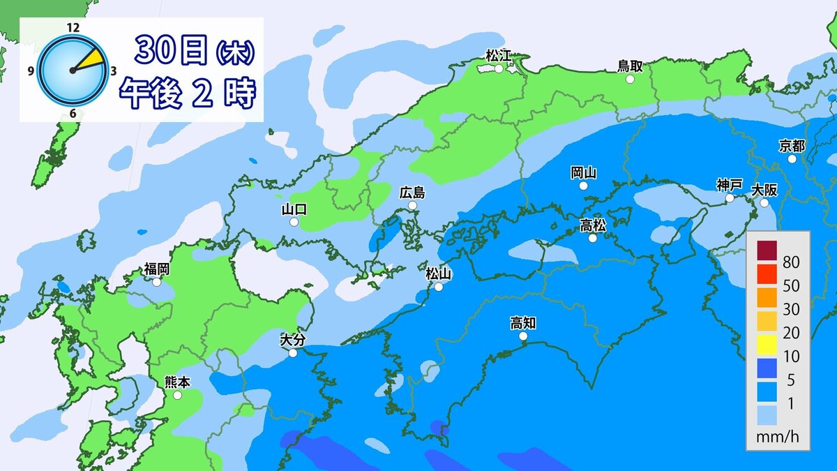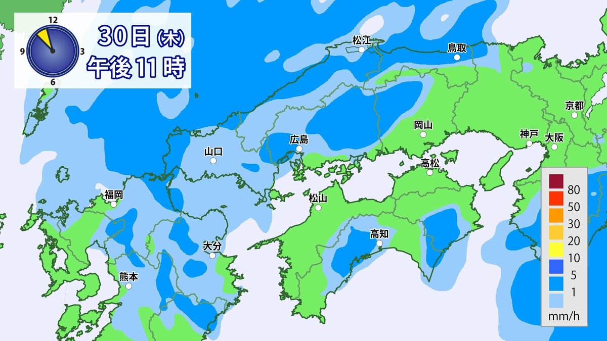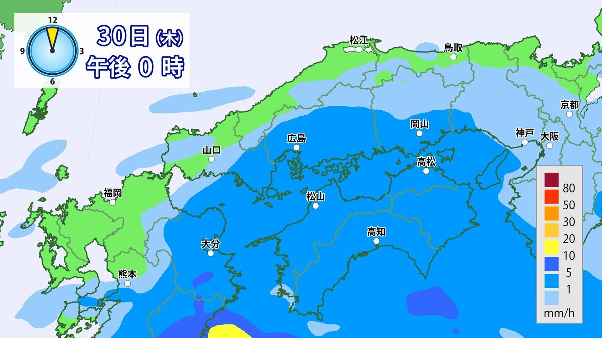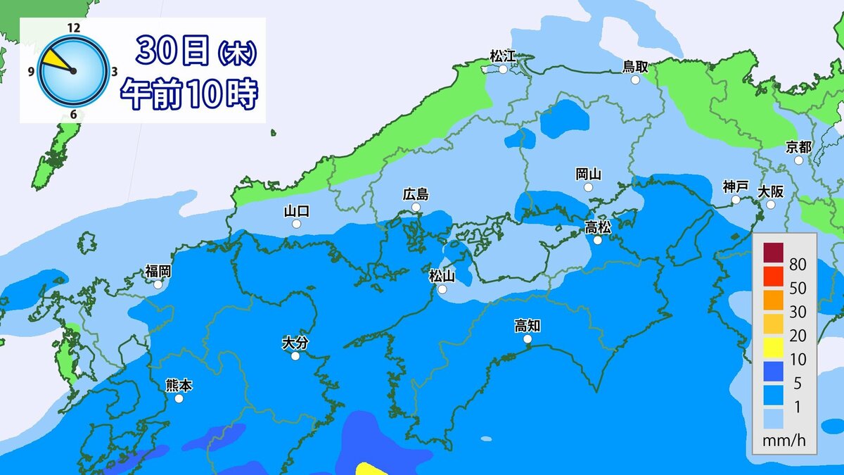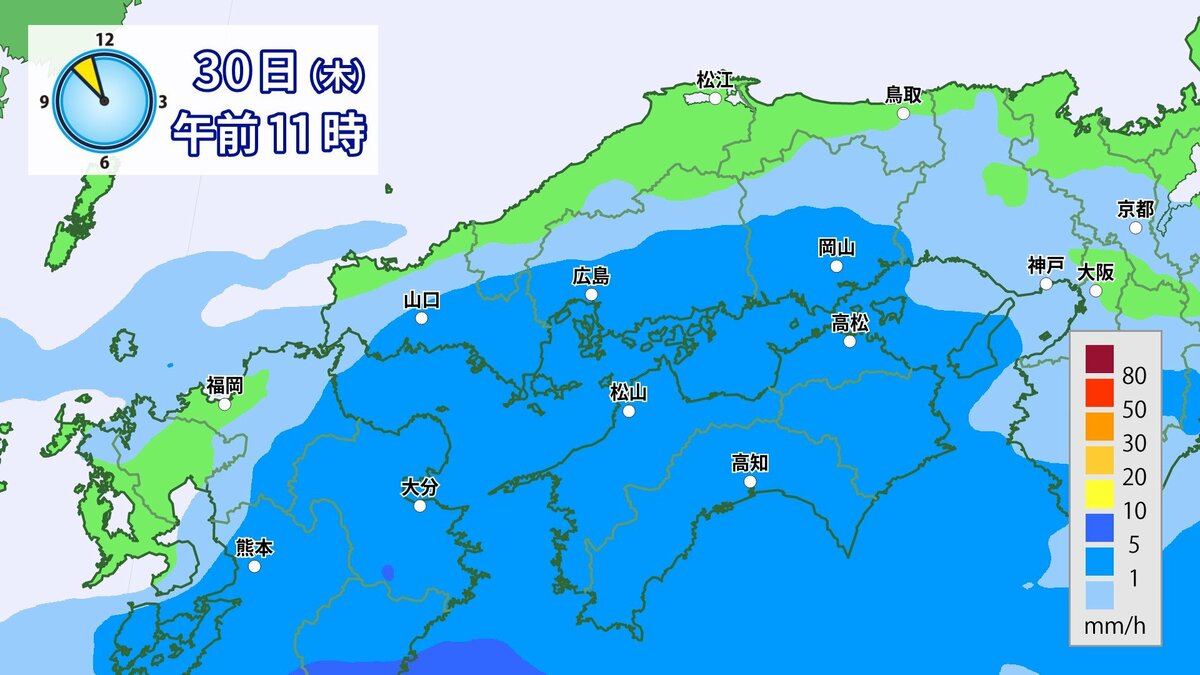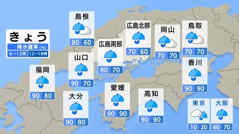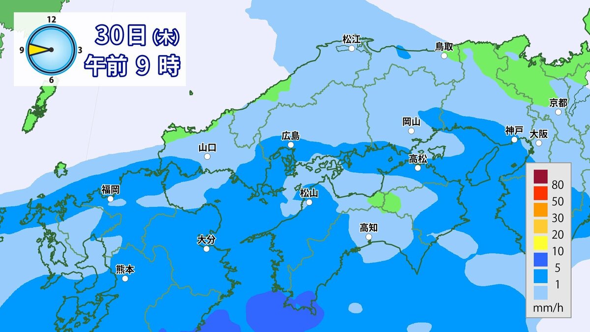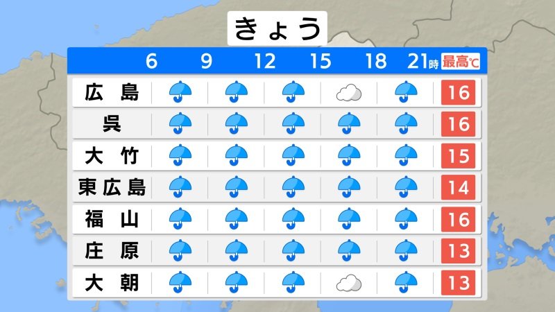 きょう30日(木)の広島県の朝は、雨が降っています。最低気温は、広島12.3℃、呉12.6℃、福山11.8℃、三次11.0℃でした。