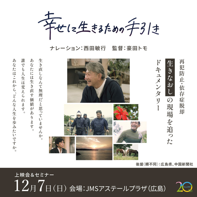 犯罪や非行、依存症からの更生(生きなおし)に関する上映会を広島で開催。上映する「幸せに生きるための手引き」は、ワンネス財団が制作し、全国の刑務所や少年院へ配布したドキュメンタリー。民間団体による実際の支援の現場を追った内容で、西田敏行さんの温かい語り口と、豪田トモ監督による感動的な映像と共に、多くの人に勇気と更生への希望を届けている。当日は依存症などで悩みを抱える本人や家族の相談に対応する。