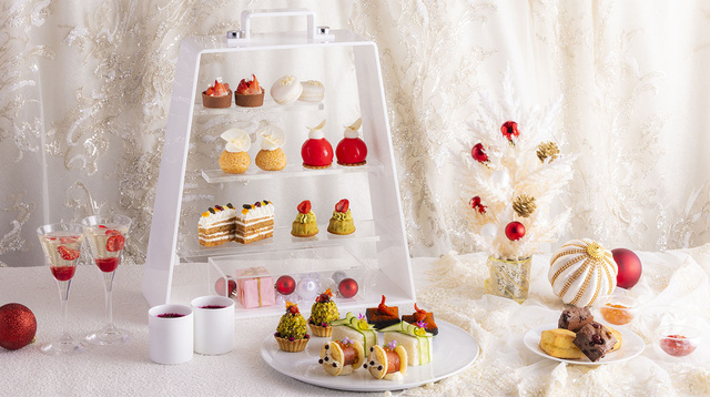 “白銀の世界で楽しむ優雅なアフタヌーンティー”をテーマとし、赤・緑・白のクリスマスカラーを取り入れた、まるでオーナメントのように煌めく愛らしいスイーツ9種類を用意。さらに「ゴートチーズのクリスマスツリーテリーヌ」や「ポーチドチキンのクリスマスギフトサンドイッチ」など、シェフが腕を振るう5種類のセイヴォリーがテーブルを華やかに彩る。心ときめくクリスマスのひとときをゆっくりと楽しもう。