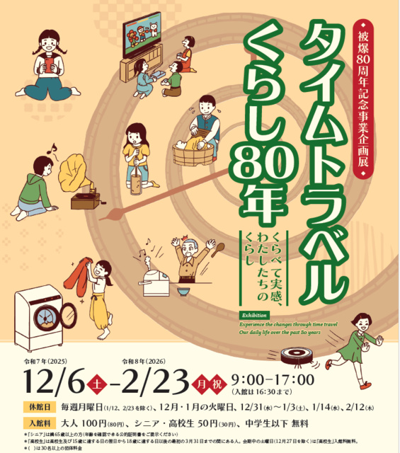 被爆から80年、その間に私たちのくらしも劇的に変わった。過去と現在を行きつ戻りつ、くらしに関わる「もの」を比べて違いを実感することで、歴史や営みの移り変わりを振り返る。