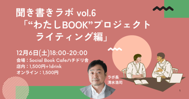 ラボ長の清水浩司による「聞き書き」を通じた交流の場。参加者が互いに聞き書きをしながら、自分のヒストリー/ストーリーを振り返る16ページの冊子を作成するワークショップシリーズ。今回は聞き書きの「書き」編。聞いた話をどう文章にまとめるか? 自分の本を作ってみたい人、自分の人生を目に見えるカタチに遺したい人、実践的に聞き書きを勉強したい人……興味のある人はお気楽にどうぞ。急げばまだ間に合う!