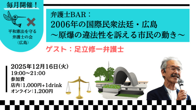2006年、2007年に広島で開かれた国際民衆法廷では、原爆投下行為を犯罪とし、実行行為者を有罪とする判決が下された。20年近くが経ち、トランプ米大統領が核実験の再開を指示したという大きなニュースに接する今。改めて核兵器の違法性について考えたい。民衆法廷の背景や、どのように違法性を訴えてきたのか、これからどのような動きが必要になるのか。語り手は足立修一弁護士。