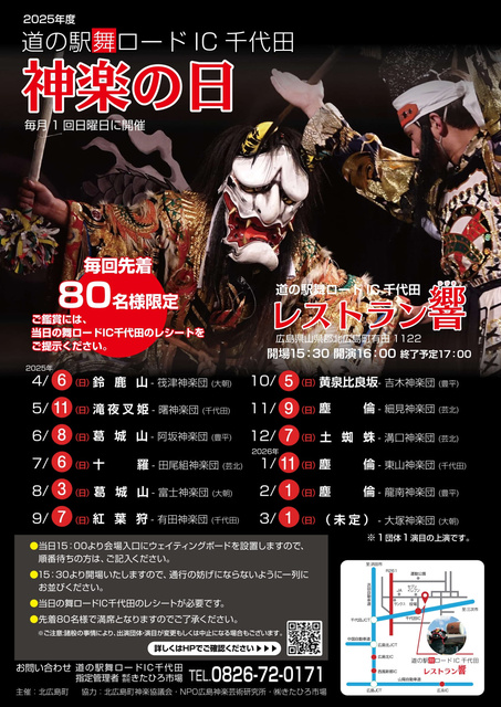 道の駅舞ロードIC千代田にて、毎月1回神楽が上演される。神楽団体の数が日本一多いと言われる北広島町の特色ある神楽を楽しめる機会で、毎回出演団体と演目が変わるので何度でも訪れたくなる。各公演の出演団体・演目はHP参照。定員は各回先着80名。