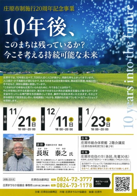 庄原市では、10年前と比べて、7,000人近く人口が減少し、高齢化率も上がってきている。人口減少・少子高齢化が進むなかで、私たちのまちは空き家の蔵か、商店街の衰退、地域の担い手不足など、深刻な課題に直面している。「このまちが10年後も元気でいられるために、今できることは何か?」参加者同士で意見を出し合い、地域課題につながる、実践的な行動プランをつくるワークショップを開催する。要申し込み。