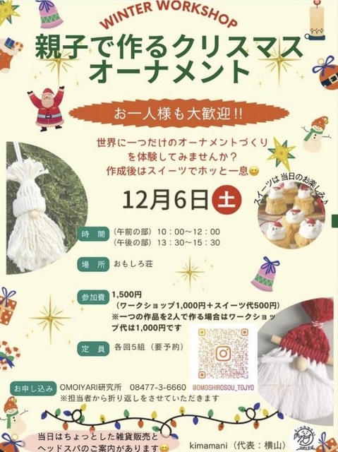 世界に一つだけのオーナメントづくりを体験してみない? 作成後はスイーツでホッと一息! 当日はちょっとした雑貨販売とヘッドスパの案内あり。定員各回5組(要予約)。