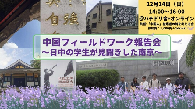 この夏、広島にゆかりのある若者たちが南京を訪問し、南京各地の日本軍による虐殺の遺跡や碑を巡った。また、侵華日軍南京大屠殺遇難同胞紀念館と南京利済巷慰安所旧址陳列館を現地ガイドに案内してもらった。途中からは中国からの留学生たちも同行。若者たちが現地で見聞きし感じ考えたことを報告する。なお1937年の12月14日は広島をはじめ日本各地で南京陥落を祝う行事が大々的に行われた日である。
