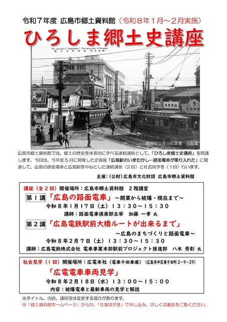 広島市郷土資料館では、郷土の歴史を体系的に学べる連続講座として、「ひろしま郷土史講座」を開講する。今年度は、5月に開催した企画展「広島駅のいまむかしー路面電車が乗り入れた」に関連して、路面電車の歴史と現在について連続講座を行う。講座は広島市郷土資料館にて受講(定員:40人)。それぞれ往復はがきとHP内申込フォームにて要申込。詳細はホームページを確認。