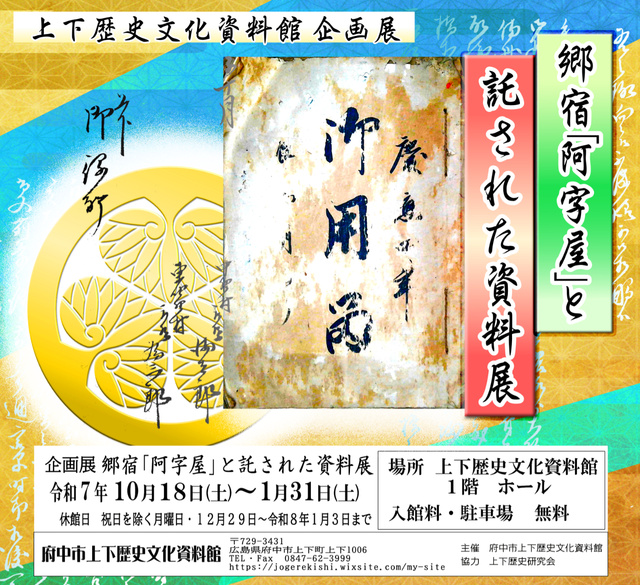 通交の要所であった上下村には石見銀山の出張陣屋があり、手代下役として郷宿「阿字屋」は公文書を作成するなどの役を担っていた。「阿字屋」から発見された「阿部主計頭宿」の宿札。手代下役として書き残した公文書の写し「御用留」。託された資料からは幕府軍の逼迫した情勢と、上下村の莫大な財力、第二長州戦争時の地域の運輸事業の中心を担っていた事などが明らかになった。初公開となる資料の数々を鑑賞しよう。