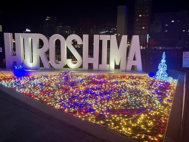 広島の玄関口・広島駅周辺地区の魅力向上に取り組む「広島駅周辺地区まちづくり協議会」による恒例のイルミネーション。エールエールA館の協力のもと、普段からライトアップされている川の駅の川沿いフェンスに加え、HIROSHIMAベンチ前にも光の装飾を施している。冬の夜の撮影スポットとして観光客等から好評だ。