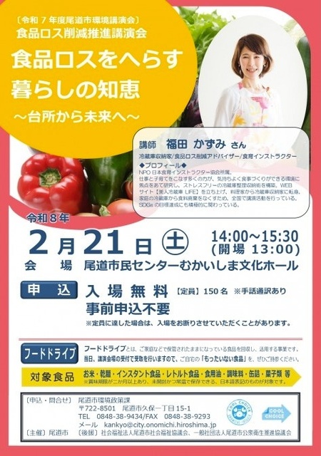 冷蔵庫収納家・食品ロス削減アドバイザーの 福田かずみさんによる講演会。家庭の台所からできる食品ロス削減の工夫や、無理なく続けられる冷蔵庫整理のコツなど、毎日の暮らしにすぐ役立つ知恵を分かりやすくお話しする。SDGsにもつながる、身近で実践しやすい内容の講演。定員150名、事前申込不要。