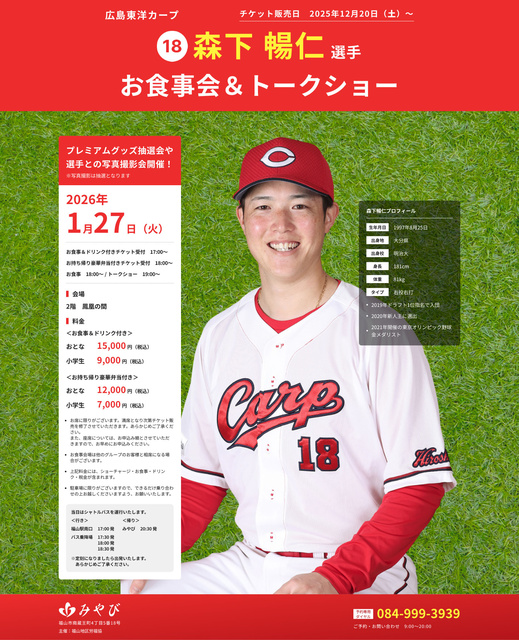 広島東洋カープ・森下暢仁選手を迎えて、「お食事会&トークショー」を開催。普段なかなか聞くことのできないプロ野球選手としての舞台裏やシーズン中のエピソード等を、森下選手の言葉でたっぷりと語ってもらう。また、トークコーナーのほか、プレミアムグッズ抽選会や写真撮影会も予定しており、ファンにとって忘れられないひとときとなるイベント。※写真撮影は抽選。