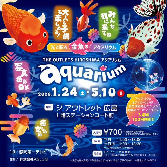 全国の珍しい金魚が大集合!! ライトアップされた水槽で泳ぐ金魚が演出する幻想的で優雅で癒される異空間を体験してみよう。大人から子供まで幅広く誰もが楽しめるアクアリウムとなっている。来場者全員にオリジナルクリアファイルプレゼント!
