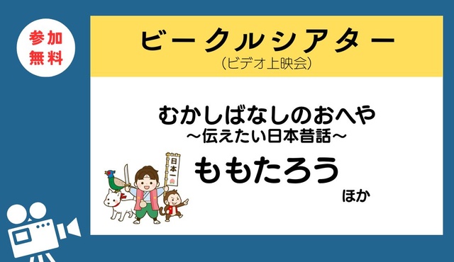 「むかしばなしのおへや ~伝えたい日本昔話~ 「ももたろう」他」のビデオ上映会。定員各回80人。申込不要で誰でも楽しめる。