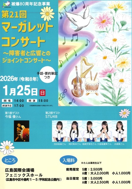 マーガレットコンサートとは障害者と広島交響楽団とで一つの音楽を作り上げる、今年で21回目となるコンサート。今回は、被爆80周年記念事業の一環として、特別なプログラムで届ける。指揮は粟辻聡さん、管弦楽は広島交響楽団。第1部はゲストに和太鼓奏者の今福優さんを迎えての「和太鼓とオーケストラ」。第2部はゲストにSTU48のメンバーを迎えての「合唱とオーケストラ」を予定。