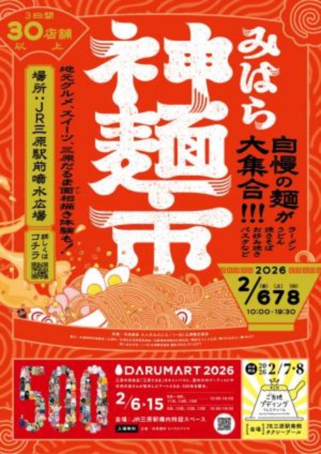 神明市のにぎわいとともに楽しめる「三原神麺市」。JR三原駅前に、三原を中心に30店舗以上の麺のお店が集まる。ラーメン、うどん、お好み焼き、パスタなど種類も豊富。昨年は6万人を超える来場者が訪れ、祭りの熱気と麺の香りに包まれた。家族や友だちと食べ歩きながら、お気に入りの一杯を見つけよう。